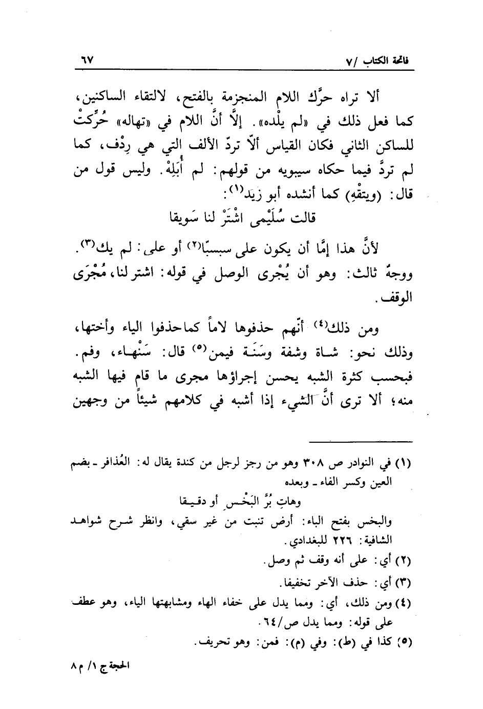 (1) في النوادر ص 308 وهو من رجز لرجل من كندة يقال له: العذافر- بضم العين وكسر الفاء- وبعده وهات برّ البخس أو دقيقا والبخس بفتح الباء: أرض تنبت من غير سقي، وانظر شرح شواهد الشافية: 226 للبغدادي.