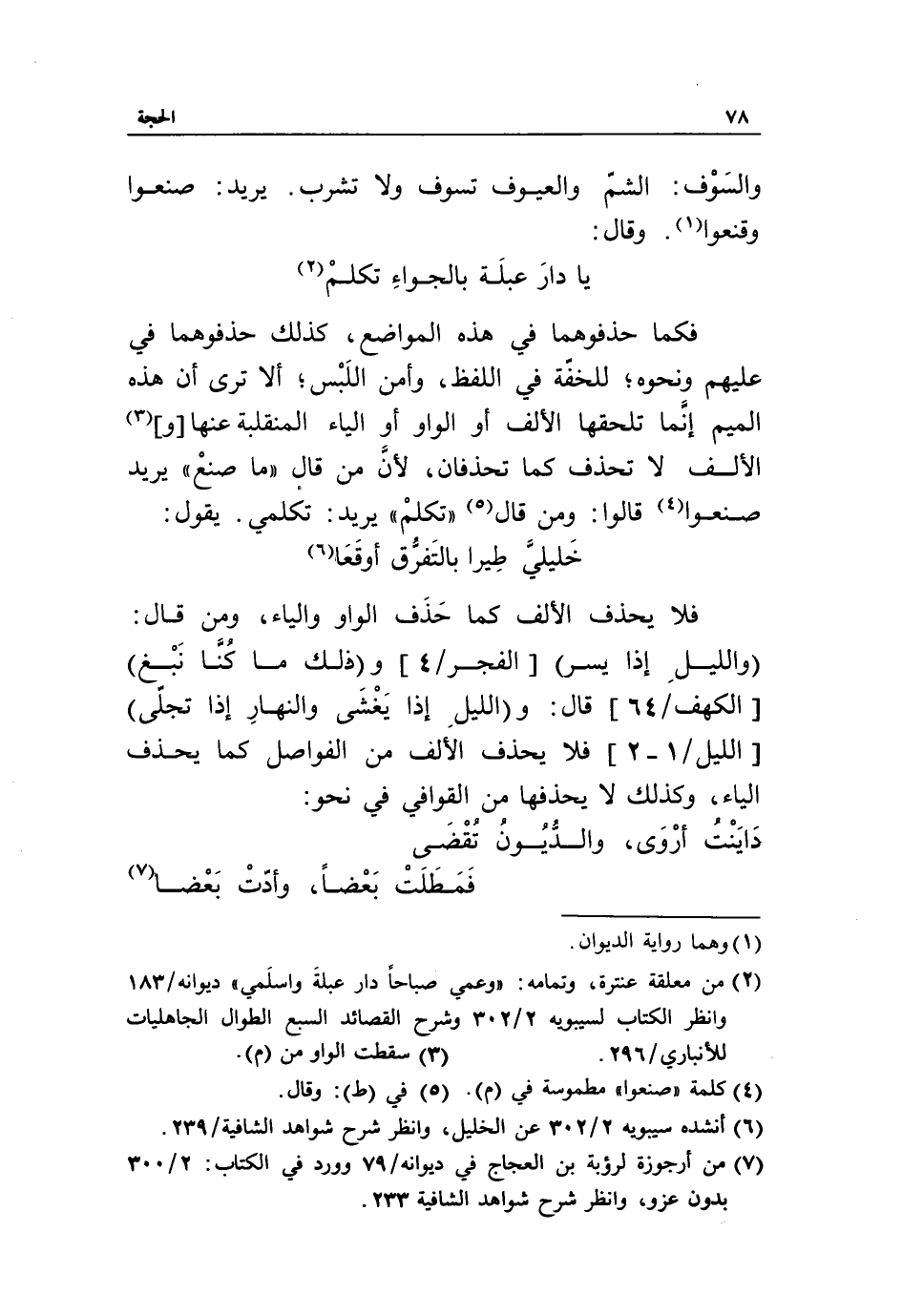 يا دار عبلة بالجواء تكلم «2» فكما حذفوهما في هذه المواضع، كذلك حذفوهما في عليهم ونحوه، للخفّة في اللفظ، وأمن اللبس، ألا ترى أن هذه الميم إنّما تلحقها الألف أو الواو أو الياء المنقلبة عنها [و] «3» الألف لا تحذف كما تحذفان، لأنّ من قال «ما صنع» يريد صنعوا «4» قالوا: ومن قال «5» «تكلم» يريد: تكلمي. يقول: