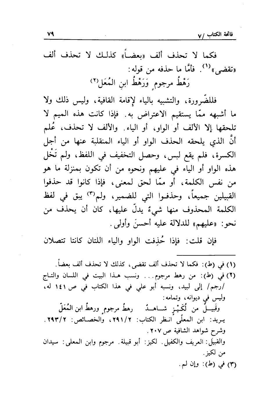 رهط مرجوم ورهط ابن المعل «2» فللضّرورة، والتشبيه بالياء لإقامة القافية، وليس ذلك ولا ما أشبهه ممّا يستقيم الاعتراض به. فإذا كانت هذه الميم لا تلحقها إلا الألف أو الواو، أو الياء. والألف لا تحذف، علم أنّ الذي يلحقه الحذف الواو أو الياء المنقلبة عنها من أجل الكسرة، فلم يقع لبس، وحصل التخفيف في اللفظ، ولم تخل هذه الواو أو الياء في عليهم ونحوه من أن تكون بمنزلة ما هو من نفس الكلمة، أو ممّا لحق لمعنى، فإذا كانوا قد حذفوا القبيلين جميعا، وحذفوا التي للضمير، ولم «3» يبق في لفظ الكلمة المحذوف منها شيء يدلّ عليها، كان أن يحذف من نحو: «عليهم» للدلالة عليه أحسن وأولى.