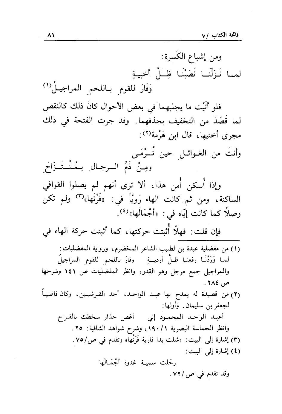 «1» فلو أتيت ما يجلبهما في بعض الأحوال كان ذلك كالنقض لما قصد من التخفيف بحذفهما. وقد جرت الفتحة في ذلك مجرى أختيها، قال ابن هرمة «2»: