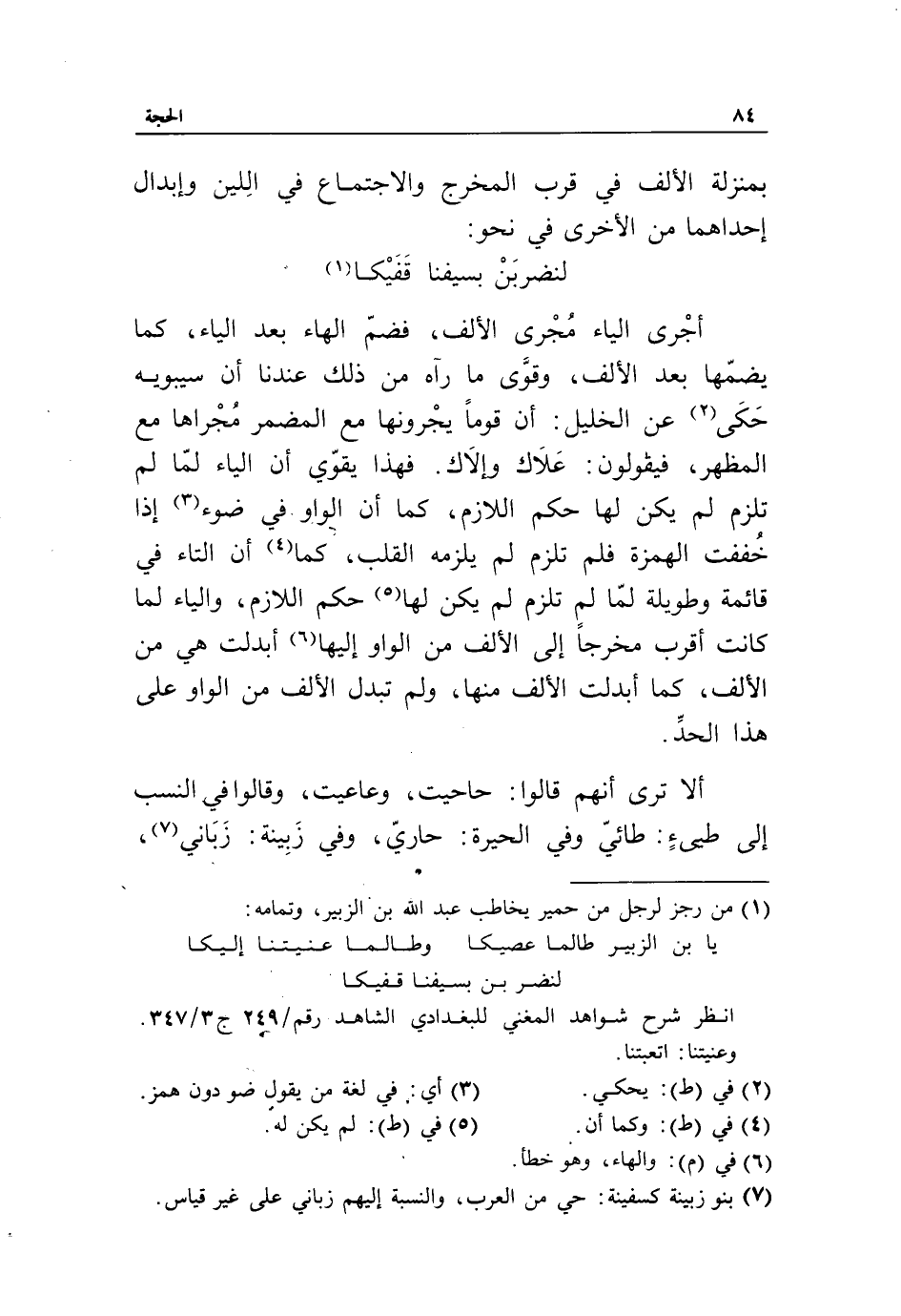 ألا ترى أنهم قالوا: حاحيت، وعاعيت، وقالوا في النسب إلى طيئ: طائيّ وفي الحيرة: حاريّ، وفي زبينة: زباني «7»،