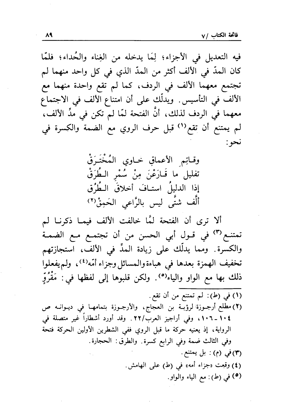 (2) مطلع أرجوزة لرؤبة بن العجاج، والأرجوزة بتمامها في ديوانه ص 104 - 106، وفي أراجيز العرب/ 22. وقد أورد أشطارا غير متصلة في الرواية، إذ يعنيه حركة ما قبل الروي ففي الشطرين الأولين الحركة فتحة وفي الثالث ضمة وفي الرابع كسرة. والطرق: الحجارة.