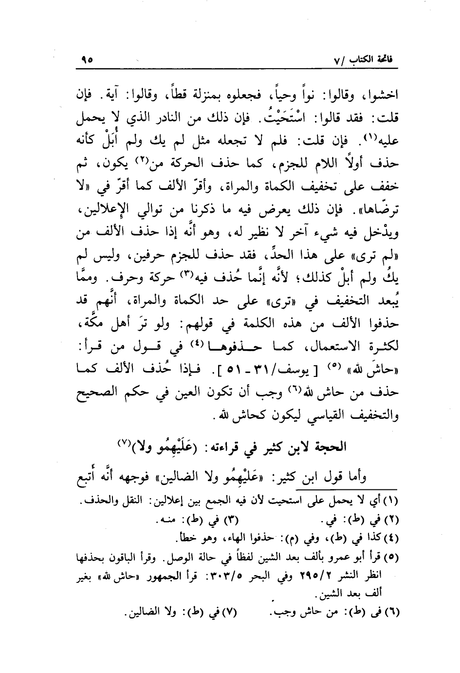 الحجة لابن كثير في قراءته: (عليهمو ولا) «7» وأما قول ابن كثير: «عليهمو ولا الضالين» فوجهه أنّه أتبع