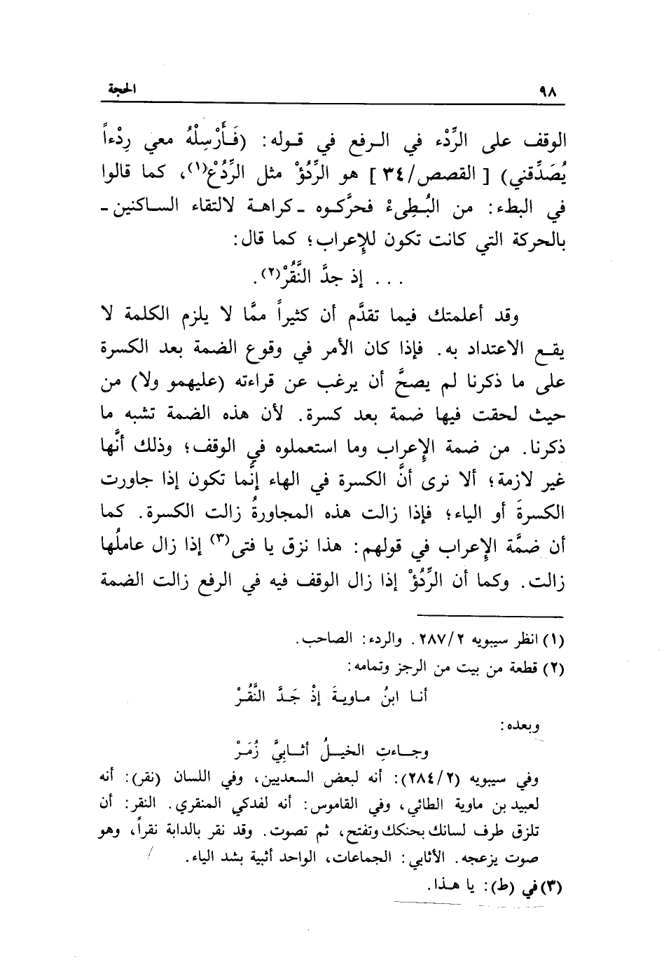 وقد أعلمتك فيما تقدّم أن كثيرا ممّا لا يلزم الكلمة لا يقع الاعتداد به. فإذا كان الأمر في وقوع الضمة بعد الكسرة على ما ذكرنا لم يصحّ أن يرغب عن قراءته (عليهمو ولا) من حيث لحقت فيها ضمة بعد كسرة. لأن هذه الضمة تشبه ما ذكرنا. من ضمة الإعراب وما استعملوه في الوقف، وذلك أنّها غير لازمة، ألا نرى أنّ الكسرة في الهاء إنّما تكون إذا جاورت الكسرة أو الياء، فإذا زالت هذه المجاورة زالت الكسرة. كما أن ضمّة الإعراب في قولهم: هذا نزق يا فتى «3» إذا زال عاملها زالت. وكما أن الرّدؤ إذا زال الوقف فيه في الرفع زالت الضمة