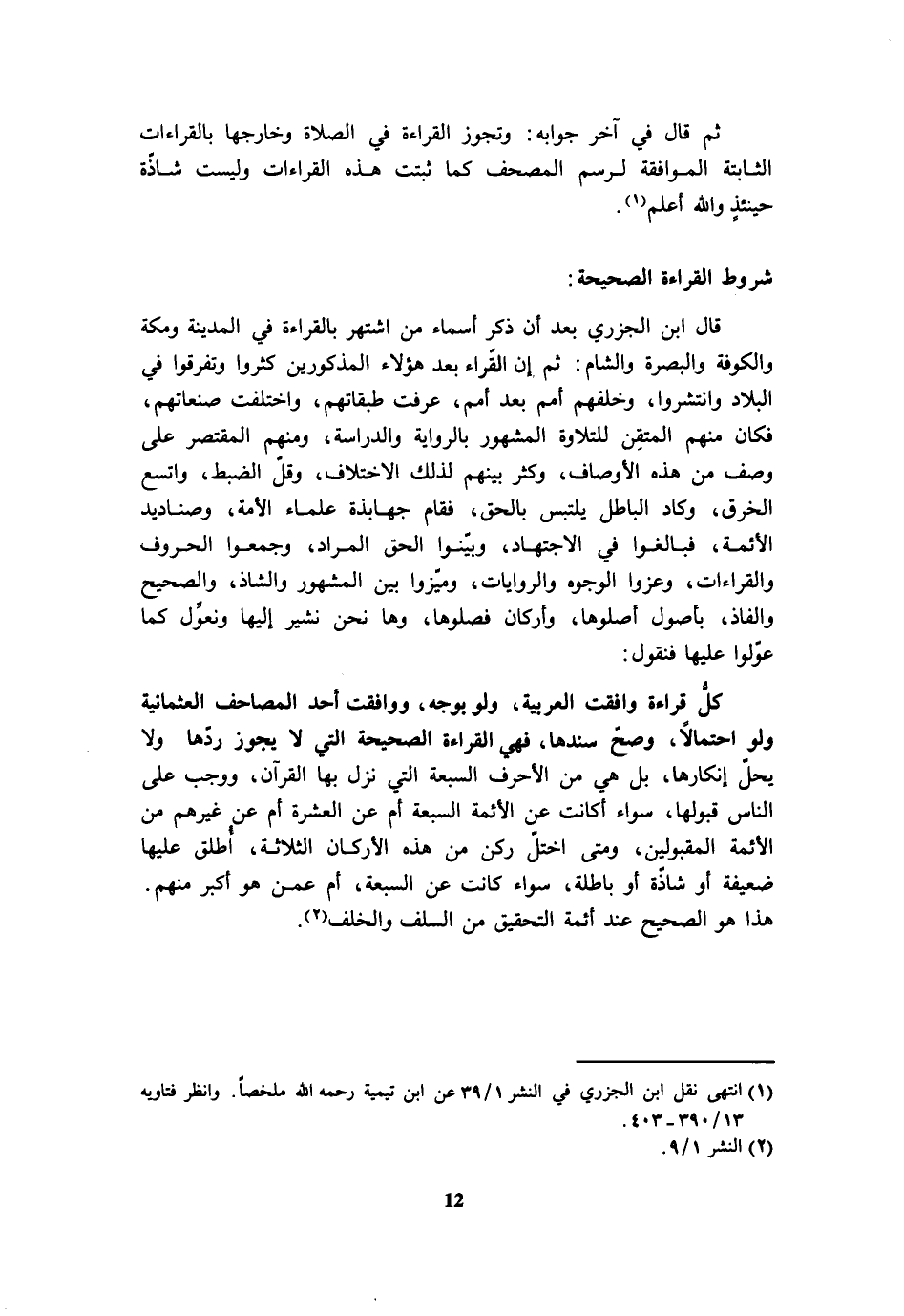 (1) انتهى نقل ابن الجزري في النشر 1/ 39 عن ابن تيمية رحمه الله ملخصا. وانظر فتاويه 13/ 390 - 403.