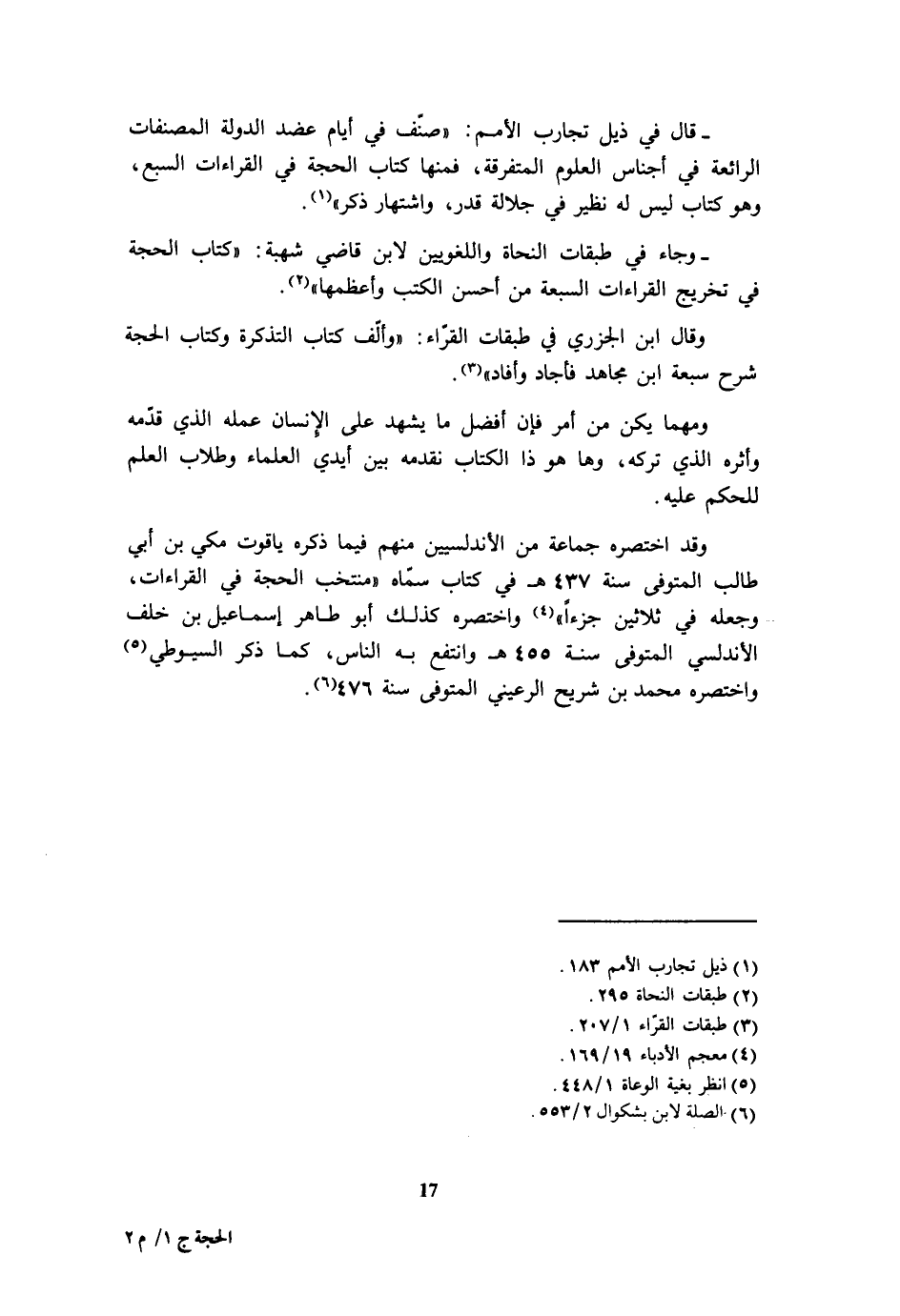 - وجاء في طبقات النحاة واللغويين لابن قاضي شهبة: «كتاب الحجة في تخريج القراءات السبعة من أحسن الكتب وأعظمها» «2».