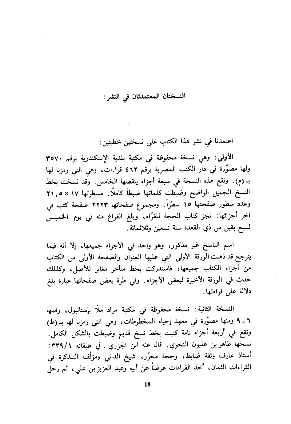 الأولى: وهي نسخة محفوظة في مكتبة بلدية الإسكندرية برقم 3570 ولها مصوّرة في دار الكتب المصرية برقم 462 قراءات، وهي التي رمزنا لها ب (م). وتقع هذه النسخة في سبعة أجزاء ينقصها الخامس. وقد نسخت بخط النسخ الجميل الواضح وضبطت كلماتها ضبطا كاملا. مسطرتها 17 × 5.21 وعدد سطور صفحتها 15 سطرا. ومجموع صفحاتها 2223 صفحة كتب في آخر أجزائها: نجز كتاب الحجة للقرّاء، وبلغ الفراغ منه في يوم الخميس لسبع بقين من ذي القعدة سنة تسعين وثلاثمائة.
