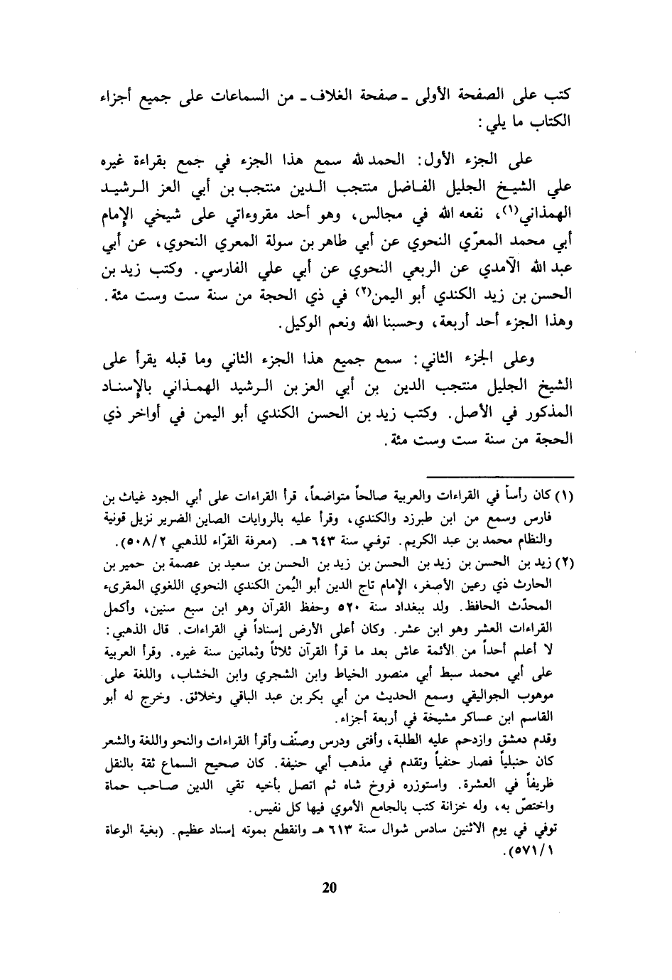 على الجزء الأول: الحمد لله سمع هذا الجزء في جمع بقراءة غيره علي الشيخ الجليل الفاضل منتجب الدين منتجب بن أبي العز الرشيد الهمذاني «1»، نفعه الله في مجالس، وهو أحد مقروءاتي على شيخي الإمام أبي محمد المعرّي النحوي عن أبي طاهر بن سولة المعري النحوي، عن أبي عبد الله الآمدي عن الربعي النحوي عن أبي علي الفارسي. وكتب زيد بن الحسن بن زيد الكندي أبو اليمن «2» في ذي الحجة من سنة ست وست مائة.