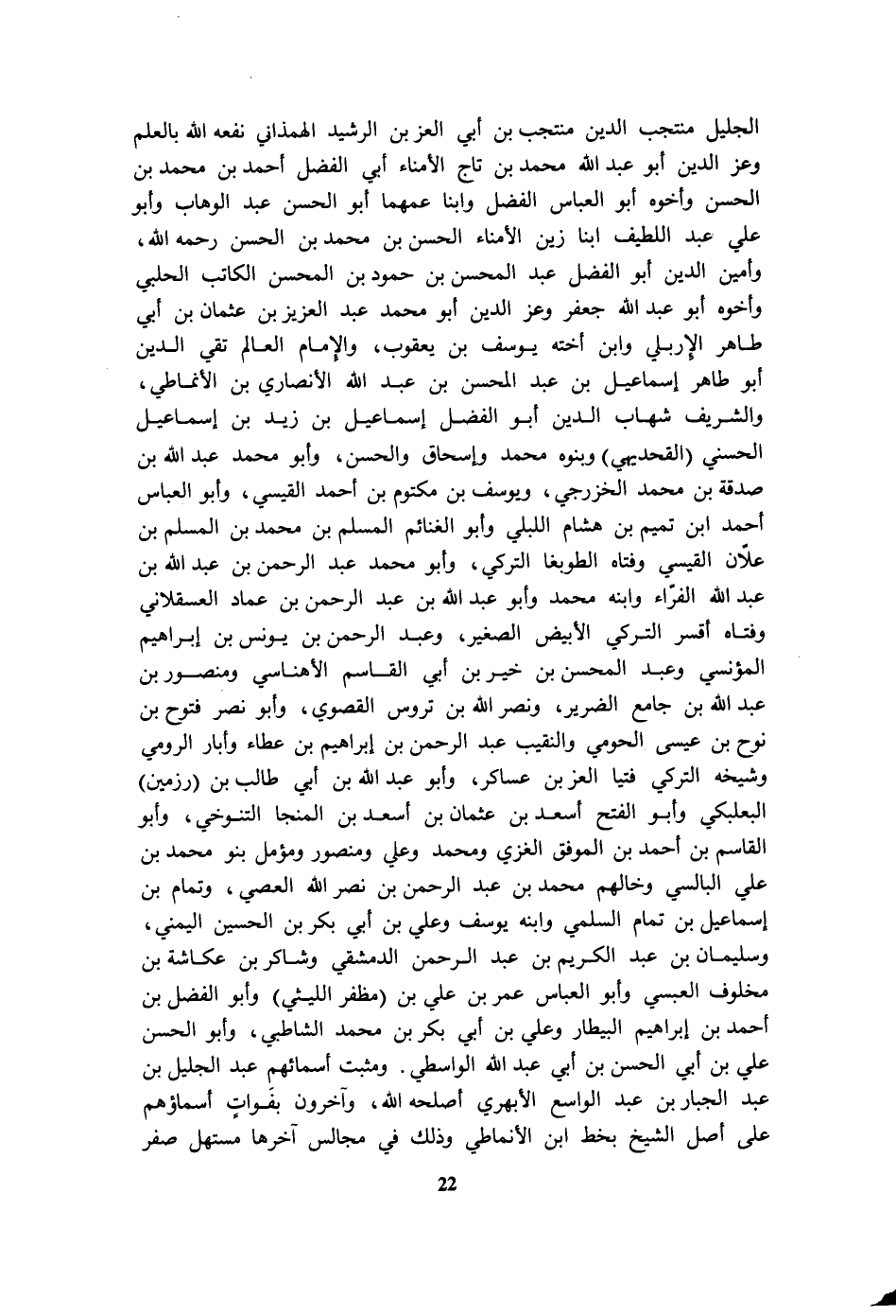 الجليل منتجب الدين منتجب بن أبي العز بن الرشيد الهمذاني نفعه الله بالعلم وعز الدين أبو عبد الله محمد بن تاج الأمناء أبي الفضل أحمد بن محمد بن الحسن وأخوه أبو العباس الفضل وابنا عمهما أبو الحسن عبد الوهاب وأبو علي عبد اللطيف ابنا زين الأمناء الحسن بن محمد بن الحسن رحمه الله، وأمين الدين أبو الفضل عبد المحسن بن حمود بن المحسن الكاتب الحلبي وأخوه أبو عبد الله جعفر وعز الدين أبو محمد عبد العزيز بن عثمان بن أبي طاهر الإربلي وابن أخته يوسف بن يعقوب، والإمام العالم تقي الدين أبو طاهر إسماعيل بن عبد المحسن بن عبد الله الأنصاري بن الأنماطي، والشريف شهاب الدين أبو الفضل إسماعيل بن زيد بن إسماعيل الحسني (القحديهي) وبنوه محمد وإسحاق والحسن، وأبو محمد عبد الله بن صدقة بن محمد الخزرجي، ويوسف بن مكتوم بن أحمد القيسي، وأبو العباس أحمد ابن تميم بن هشام اللبلي وأبو الغنائم المسلم بن محمد بن المسلم بن علّان القيسي وفتاه الطوبغا التركي، وأبو محمد عبد الرحمن بن عبد الله بن عبد الله الفرّاء وابنه محمد وأبو عبد الله بن عبد الرحمن بن عماد العسقلاني وفتاه أقسر التركي الأبيض الصغير، وعبد الرحمن بن يونس بن إبراهيم المؤنسي وعبد المحسن بن خير بن أبي القاسم الأهناسي ومنصور بن عبد الله بن جامع الضرير، ونصر الله بن تروس القصوي، وأبو نصر فتوح بن نوح بن عيسى الحومي والنقيب عبد الرحمن بن إبراهيم بن عطاء وأبار الرومي وشيخه التركي فتيا العز بن عساكر، وأبو عبد الله بن أبي طالب بن (رزمين) البعلبكي وأبو الفتح أسعد بن عثمان بن أسعد بن المنجا التنوخي، وأبو القاسم بن أحمد بن الموفق الغزي ومحمد وعلي ومنصور ومؤمل بنو محمد بن علي البالسي وخالهم محمد بن عبد الرحمن بن نصر الله العصي، وتمام بن إسماعيل بن تمام السلمي وابنه يوسف وعلي بن أبي بكر بن الحسين اليمني، وسليمان بن عبد الكريم بن عبد الرحمن الدمشقي وشاكر بن عكاشة بن مخلوف العبسي وأبو العباس عمر بن علي بن (مظفر الليثي) وأبو الفضل بن أحمد بن إبراهيم البيطار وعلي بن أبي بكر بن محمد الشاطبي، وأبو الحسن علي بن أبي الحسن بن أبي عبد الله الواسطي. ومثبت أسمائهم عبد الجليل بن عبد الجبار بن عبد الواسع الأبهري أصلحه الله، وآخرون بفوات أسماؤهم على أصل الشيخ بخط ابن الأنماطي وذلك في مجالس آخرها مستهل صفر