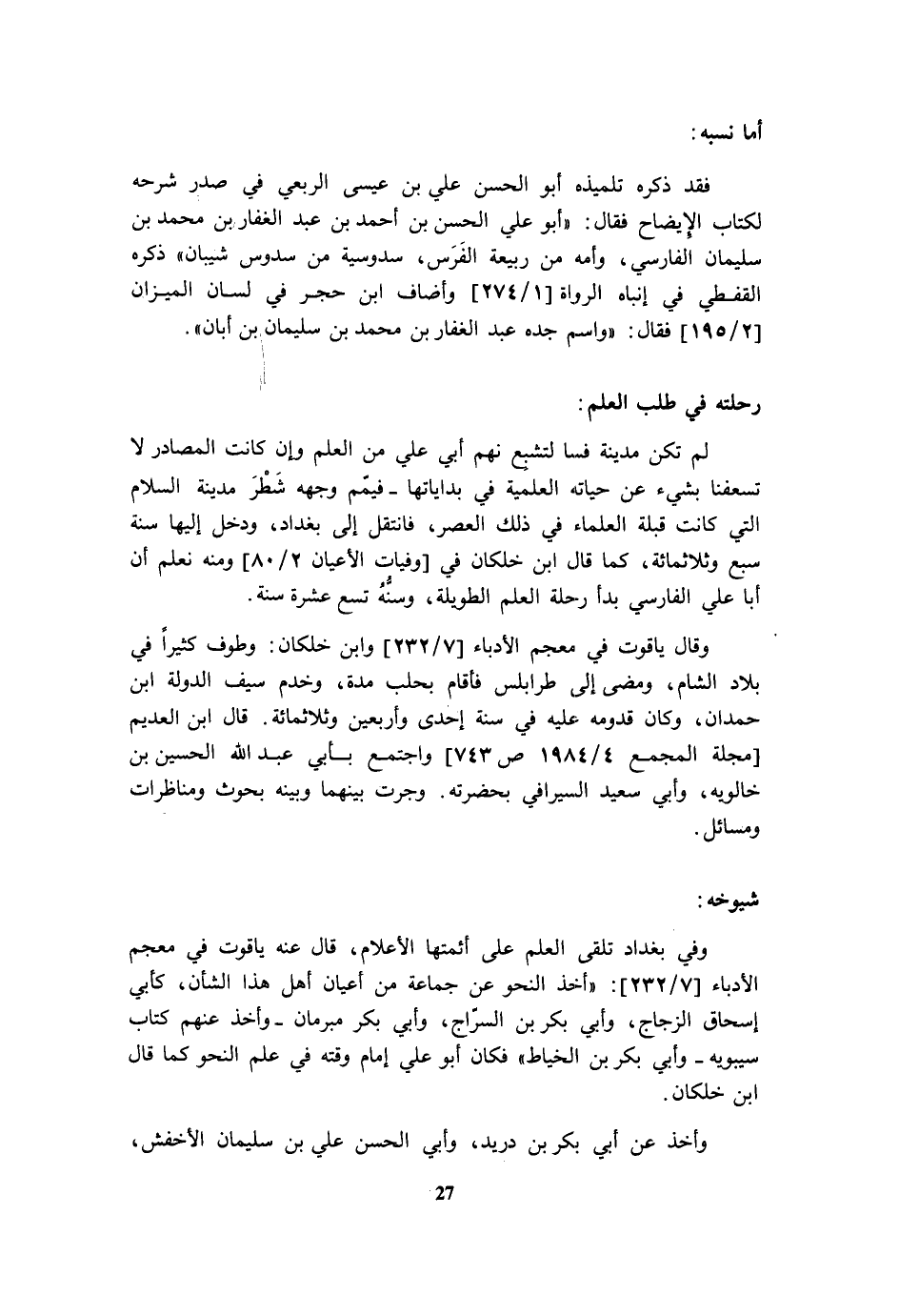 فقد ذكره تلميذه أبو الحسن علي بن عيسى الربعي في صدر شرحه لكتاب الإيضاح فقال: «أبو علي الحسن بن أحمد بن عبد الغفار بن محمد بن سليمان الفارسي، وأمه من ربيعة الفرس، سدوسية من سدوس شيبان» ذكره القفطي في إنباه الرواة [1/ 274] وأضاف ابن حجر في لسان الميزان [2/ 195] فقال: «واسم جده عبد الغفار بن محمد بن سليمان بن أبان».