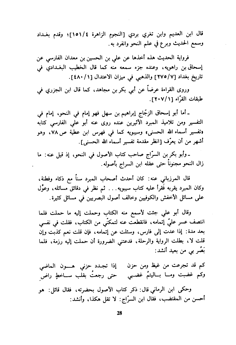 - أما أبو إسحاق الزجّاج إبراهيم بن سهل فهو إمام في النحو، إمام في التفسير ومن تلاميذ المبرد الأثيرين عنده روى عنه أبو علي الفارسي كتابه «تفسير أسماء الله الحسنى» وسيبويه كما في فهرس ابن عطية ص 78، وهو أشهر من أن يعرّف [انظر مقدمة تفسير أسماء الله الحسنى].