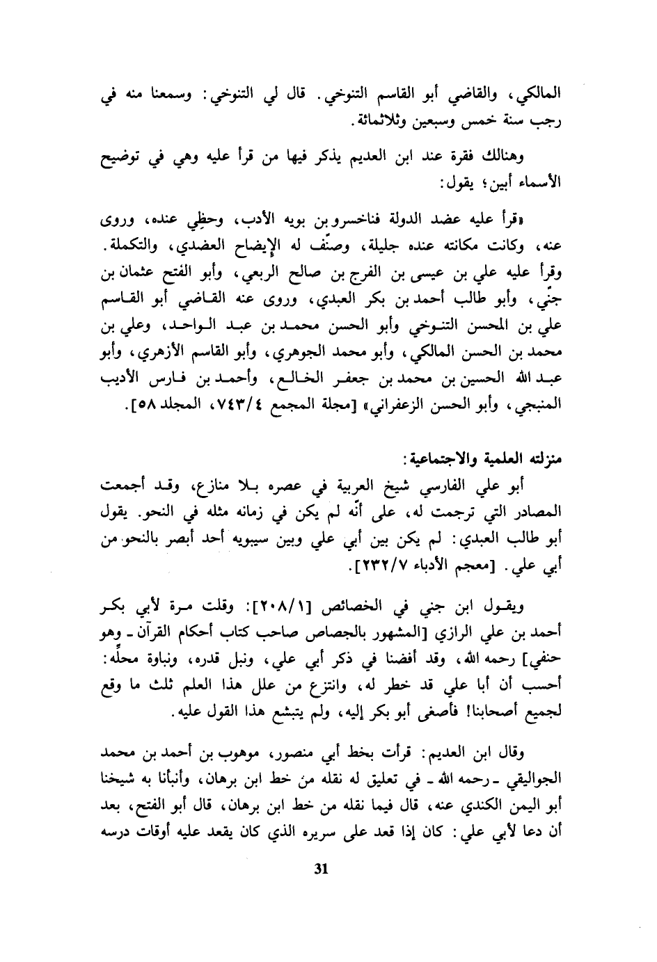 وقال ابن العديم: قرأت بخط أبي منصور، موهوب بن أحمد بن محمد الجواليقي- رحمه الله- في تعليق له نقله من خط ابن برهان، وأنبأنا به شيخنا أبو اليمن الكندي عنه، قال فيما نقله من خط ابن برهان، قال أبو الفتح، بعد أن دعا لأبي علي: كان إذا قعد على سريره الذي كان يقعد عليه أوقات درسه