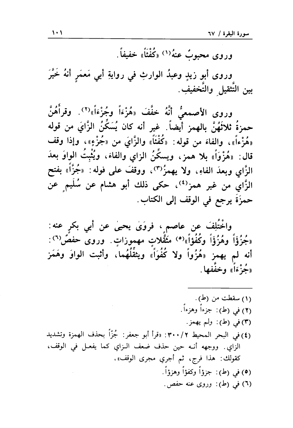 أنه لم يهمز «هزوا ولا كفوا» ويثقّلهما، وأثبت الواو وهمز «جزءا» وخفّفها.