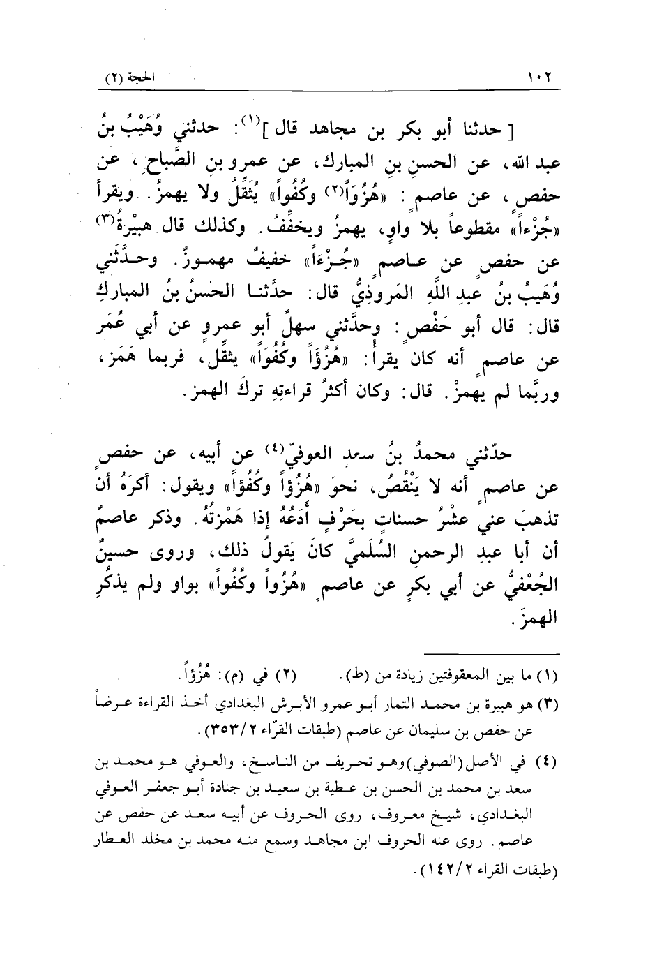 [حدثنا أبو بكر بن مجاهد قال] «1»: حدثني وهيب بن عبد الله، عن الحسن بن المبارك، عن عمرو بن الصّباح، عن حفص، عن عاصم: «هزوا «2» وكفوا» يثقّل ولا يهمز. ويقرأ «جزءا» مقطوعا بلا واو، يهمز ويخفّف. وكذلك قال هبيرة «3» عن حفص عن عاصم «جزءا» خفيف مهموز. وحدّثني وهيب بن عبد الله المروذيّ قال: حدّثنا الحسن بن المبارك قال: قال أبو حفص: وحدّثني سهل أبو عمرو عن أبي عمر عن عاصم أنه كان يقرأ: «هزؤا وكفوا» يثقّل، فربما همز، وربّما لم يهمز. قال: وكان أكثر قراءته ترك الهمز.