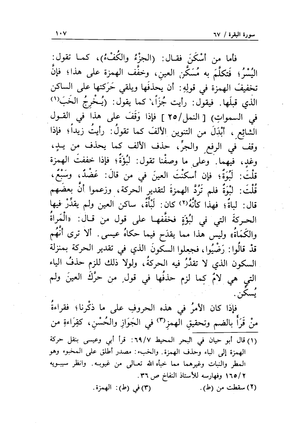 (1) قال أبو حيان في البحر المحيط 7/ 69: قرأ أبي وعيسى بنقل حركة الهمزة إلى الباء وحذف الهمزة. والخبء: مصدر أطلق على المخبوء وهو المطر والنبات وغيرهما مما خبأه الله تعالى من غيوبه. وانظر سيبويه 2/ 165 وفهارسه للأستاذ النفاخ ص 36.
