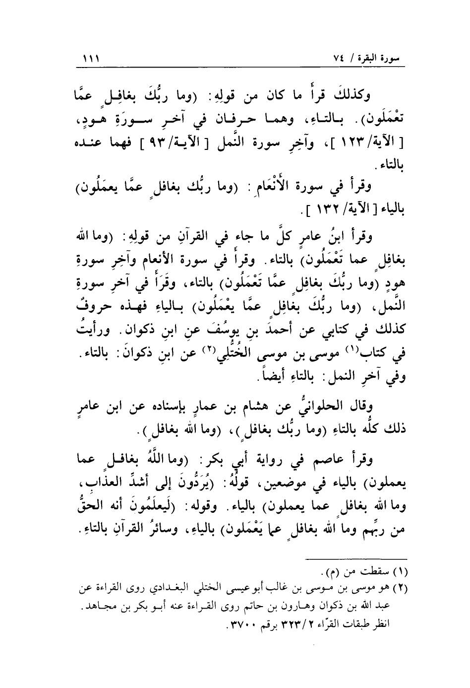 (2) هو موسى بن موسى بن غالب أبو عيسى الختلي البغدادي روى القراءة عن عبد الله بن ذكوان وهارون بن حاتم روى القراءة عنه أبو بكر بن مجاهد.