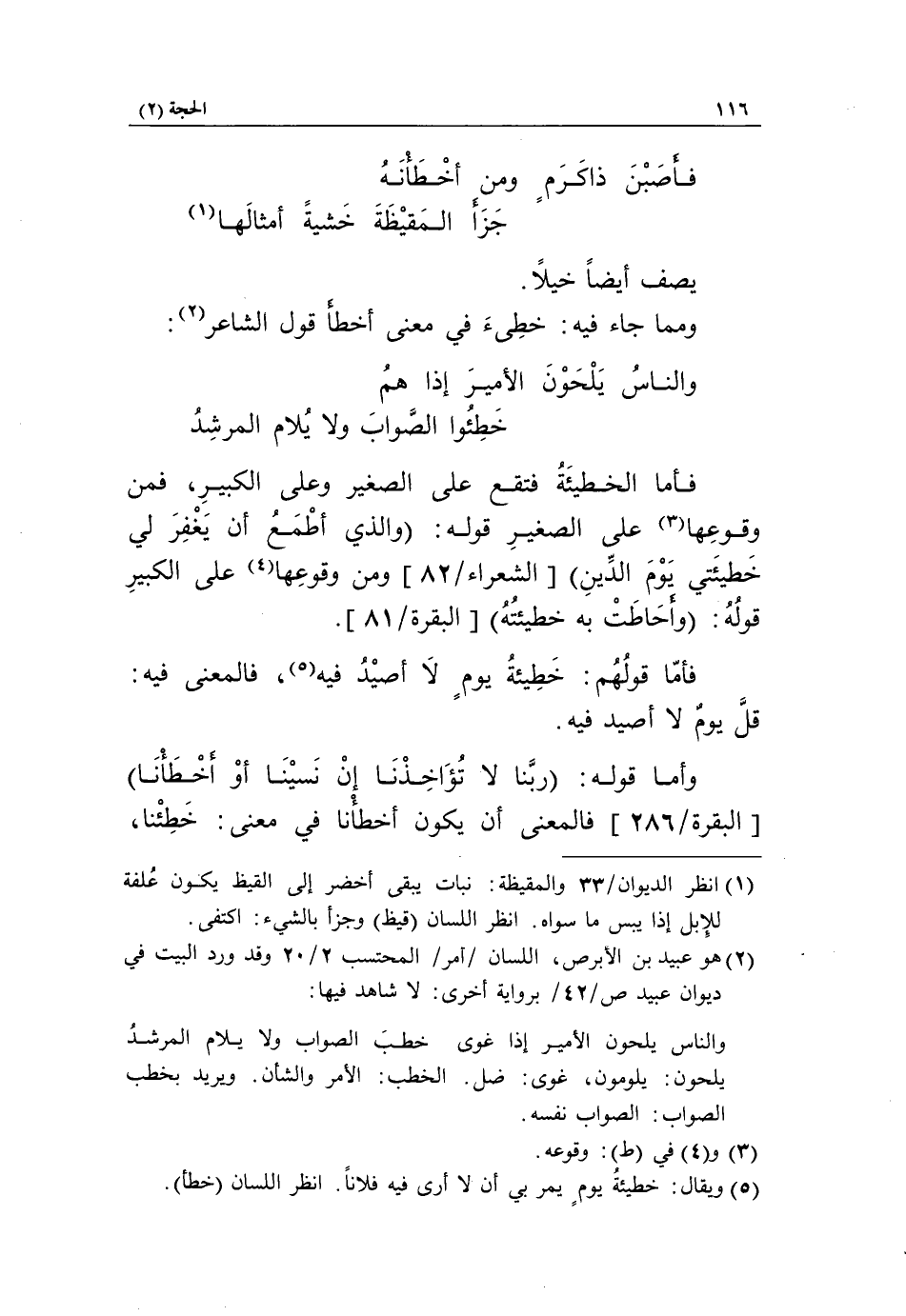 (5) ويقال: خطيئة يوم يمر بي أن لا أرى فيه فلانا. انظر اللسان (خطأ).