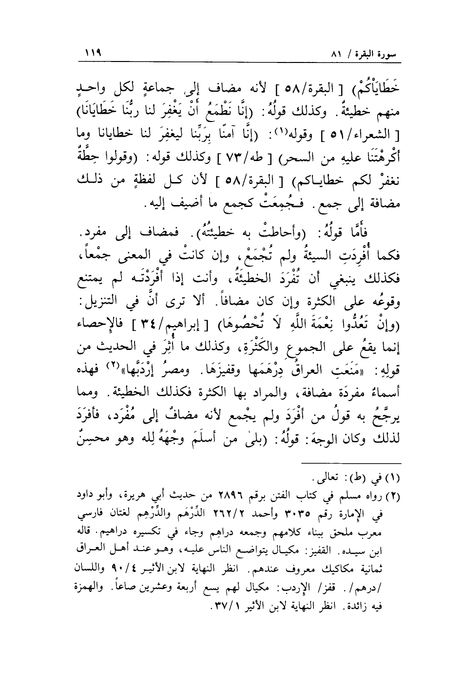 وَإِنْ تَعُدُّوا نِعْمَةَ اللَّهِ لا تُحْصُوها [إبراهيم/ 34] فالإحصاء إنما يقع على الجموع والكثرة، وكذلك ما أثر في الحديث من قوله: «منعت العراق درهمها وقفيزها. ومصر إردبّها» «2» فهذه أسماء مفردة مضافة، والمراد بها الكثرة فكذلك الخطيئة. ومما يرجّح به قول من أفرد ولم يجمع لأنه مضاف إلى مفرد، فأفرد لذلك وكان الوجه: قوله: بَلى مَنْ أَسْلَمَ وَجْهَهُ لِلَّهِ وَهُوَ مُحْسِنٌ فَلَهُ أَجْرُهُ عِنْدَ رَبِّهِ [البقرة/ 112]