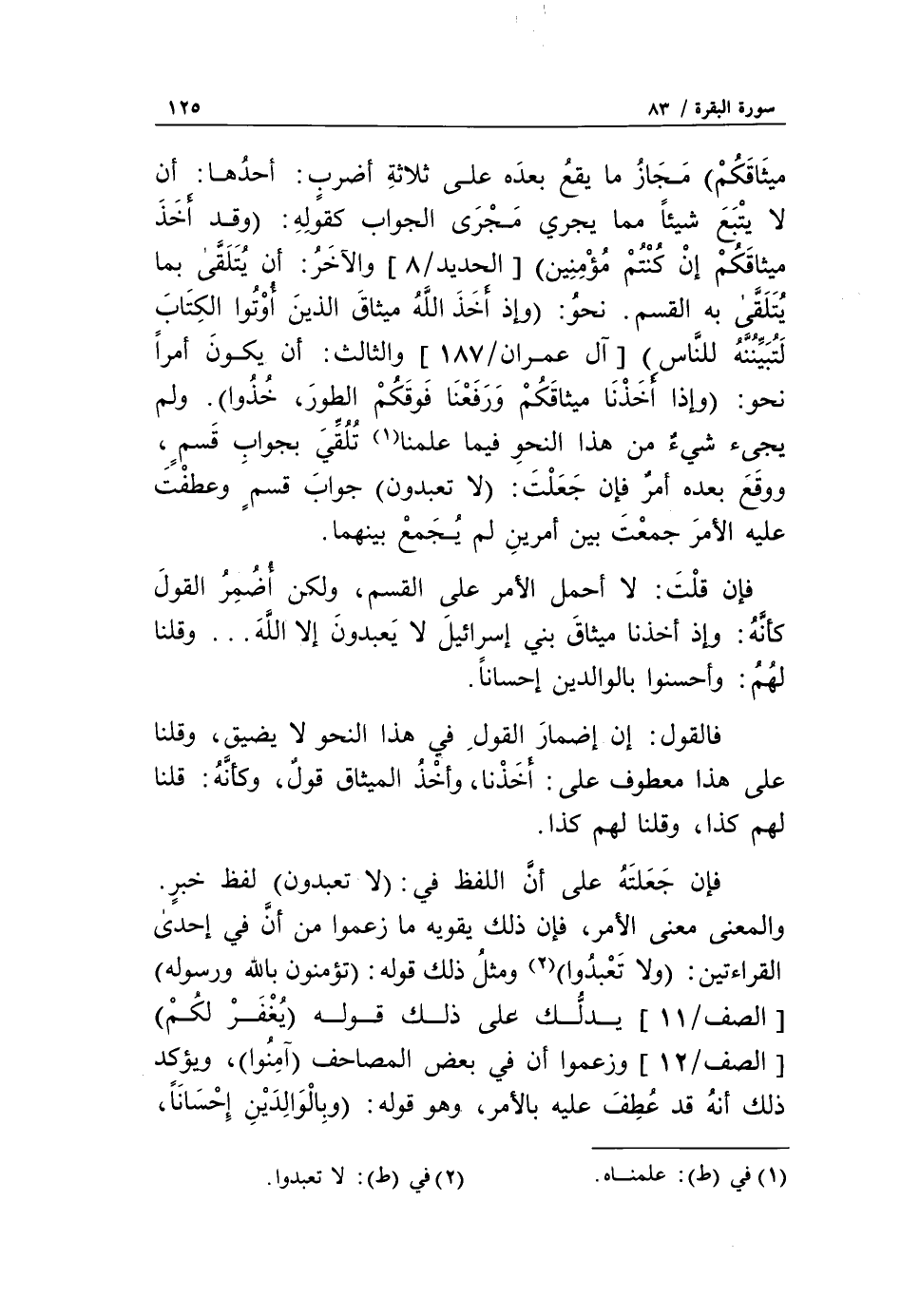 مجاز ما يقع بعده على ثلاثة أضرب: أحدها: أن لا يتبع شيئا مما يجري مجرى الجواب كقوله: وَقَدْ أَخَذَ مِيثاقَكُمْ إِنْ كُنْتُمْ مُؤْمِنِينَ [الحديد/ 8] والآخر: أن يتلقّى بما يتلقّى به القسم. نحو: وَإِذْ أَخَذَ اللَّهُ مِيثاقَ الَّذِينَ أُوتُوا الْكِتابَ لَتُبَيِّنُنَّهُ لِلنَّاسِ [آل عمران/ 187] والثالث: أن يكون أمرا نحو: وَإِذْ أَخَذْنا مِيثاقَكُمْ وَرَفَعْنا فَوْقَكُمُ الطُّورَ، خُذُوا. ولم يجيء شيء من هذا النحو فيما علمنا «1» تلقّي بجواب قسم، ووقع بعده أمر فإن جعلت: لا تَعْبُدُونَ جواب قسم وعطفت عليه الأمر جمعت بين أمرين لم يجمع بينهما.