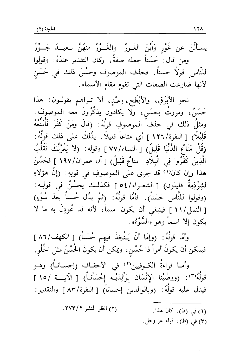 يسألن عن غور وأين الغور والغور منهنّ بعيد جور ومن قال: حسنا جعله صفة، وكان التقدير عنده: وقولوا للنّاس قولا حسنا. فحذف الموصوف وحسن ذلك في حسن لأنها ضارعت الصفات التي تقوم مقام الأسماء.