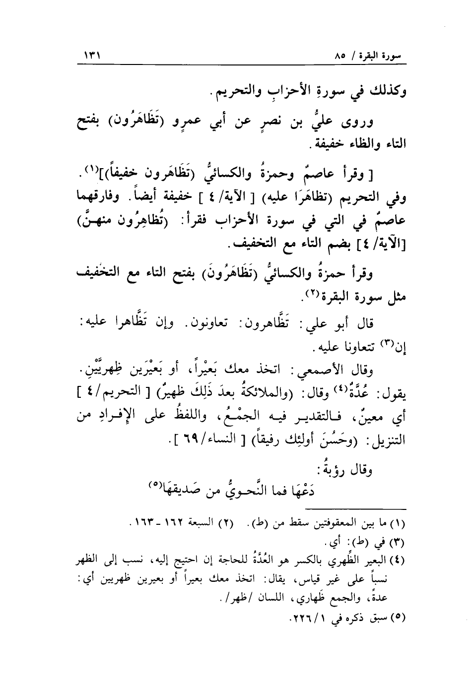 وفي التحريم تَظاهَرا عَلَيْهِ [الآية/ 4] خفيفة أيضا. وفارقهما عاصم في التي في سورة الأحزاب فقرأ: تُظاهِرُونَ مِنْهُنَّ [الآية/ 4] بضم التاء مع التخفيف.