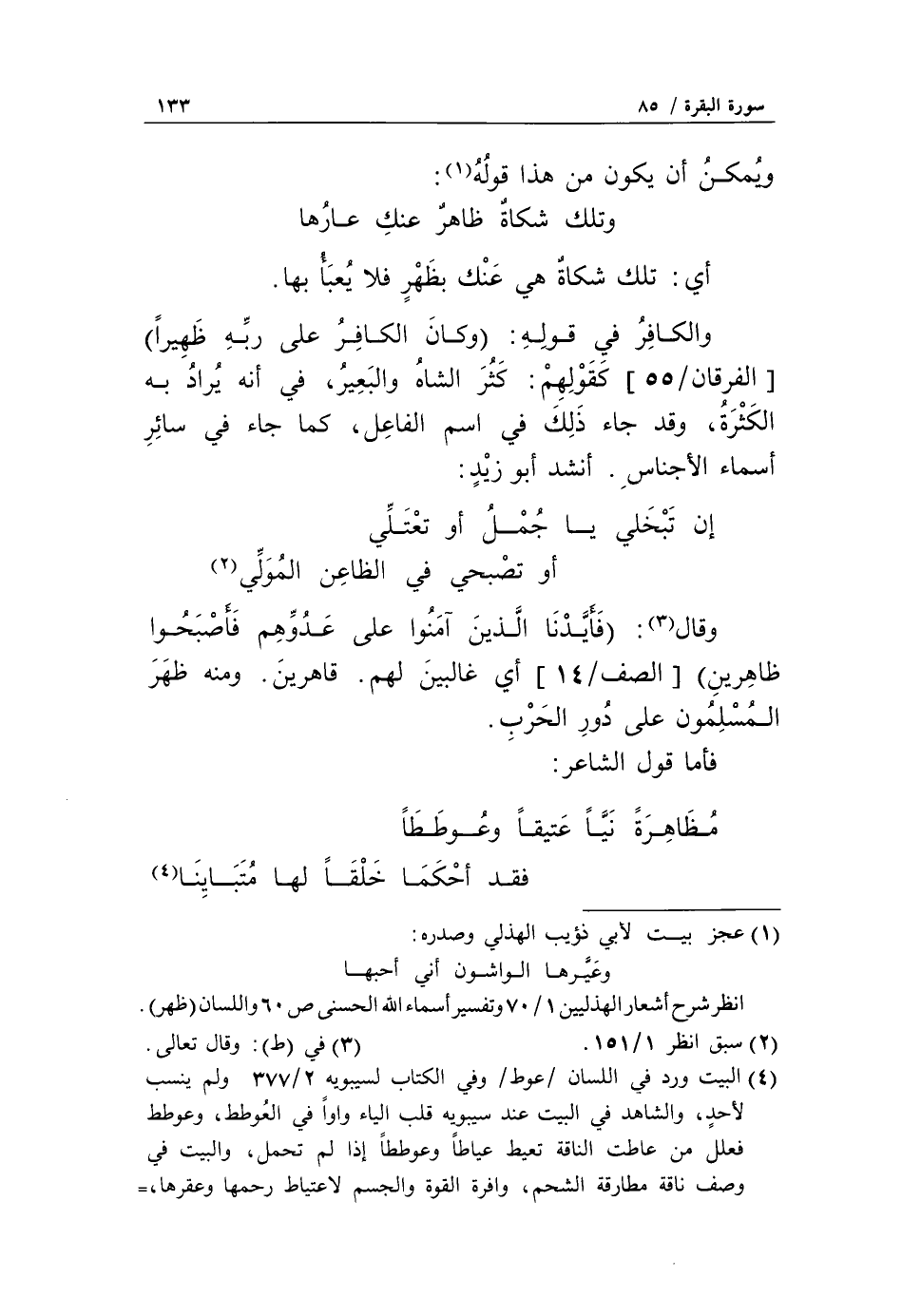 والكافر في قوله: وَكانَ الْكافِرُ عَلى رَبِّهِ ظَهِيراً [الفرقان/ 55] كقولهم: كثر الشاه والبعير، في أنه يراد به الكثرة، وقد جاء ذلك في اسم الفاعل، كما جاء في سائر أسماء الأجناس. أنشد أبو زيد: