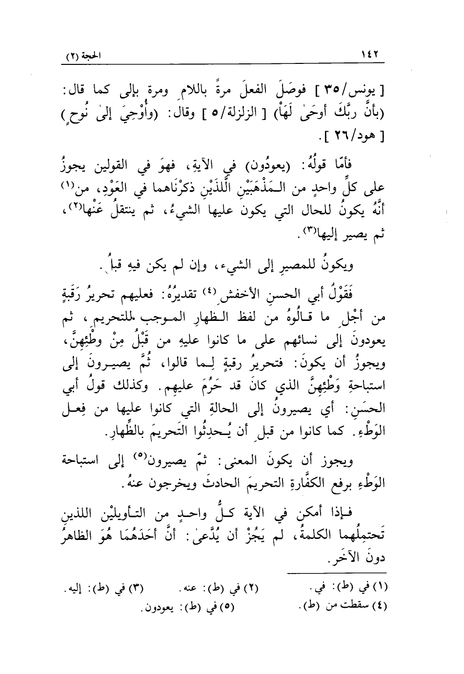 فأمّا قوله: يَعُودُونَ في الآية، فهو في القولين يجوز على كلّ واحد من المذهبين اللّذين ذكرناهما في العود، من «1» أنّه يكون للحال التي يكون عليها الشيء، ثم ينتقل عنها «2»، ثم يصير إليها «3».