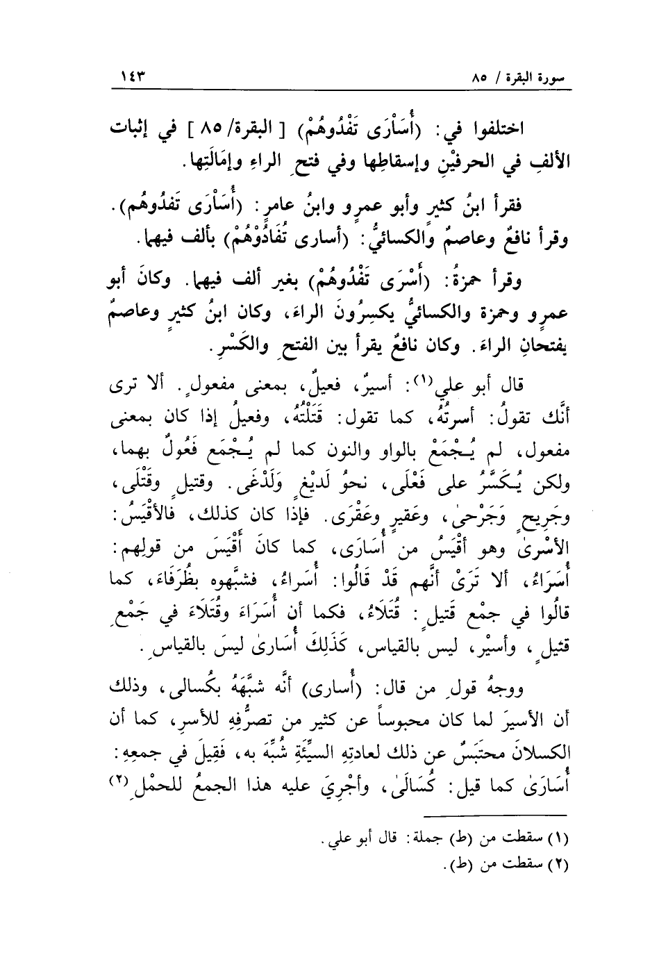 ووجه قول من قال: أُسارى أنّه شبّهه بكسالى، وذلك أن الأسير لما كان محبوسا عن كثير من تصرّفه للأسر، كما أن الكسلان محتبس عن ذلك لعادته السيّئة شبّه به، فقيل في جمعه: