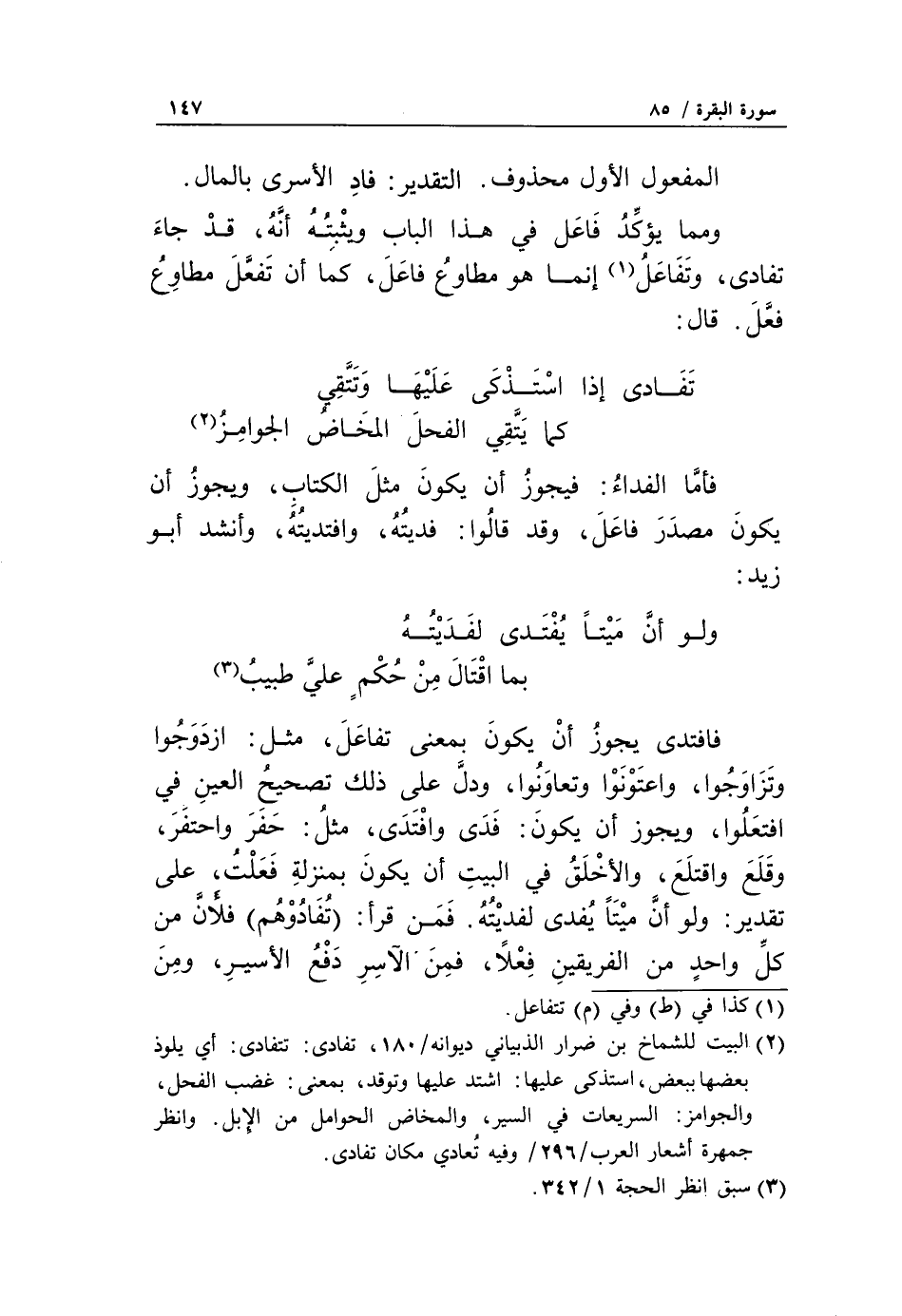 «3» فافتدى يجوز أن يكون بمعنى تفاعل، مثل: ازدوجوا وتزاوجوا، واعتونوا وتعاونوا، ودلّ على ذلك تصحيح العين في افتعلوا، ويجوز أن يكون: فدى وافتدى، مثل: حفر واحتفر، وقلع واقتلع، والأخلق في البيت أن يكون بمنزلة فعلت، على تقدير: ولو أنّ ميتا يفدى لفديته. فمن قرأ: تُفادُوهُمْ فلأنّ من كلّ واحد من الفريقين فعلا، فمن الآسر دفع الأسير، ومن