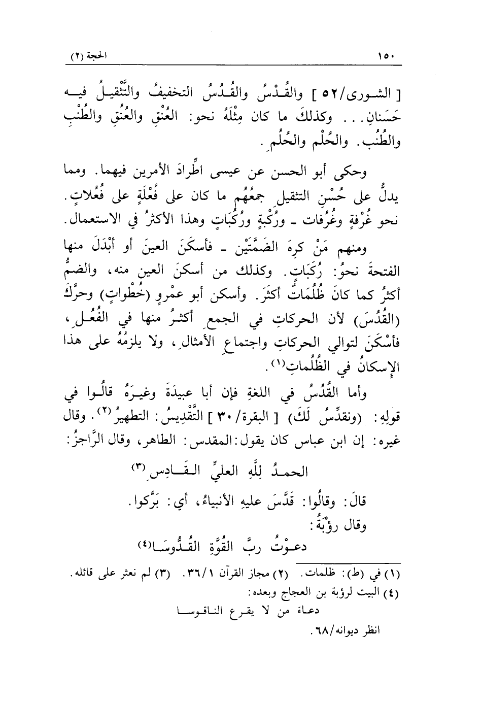 [الشورى/ 52] والقدس والقدس التخفيف والتّثقيل فيه حسنان ... وكذلك ما كان مثله نحو: العنق والعنق والطنب والطنب. والحلم والحلم.