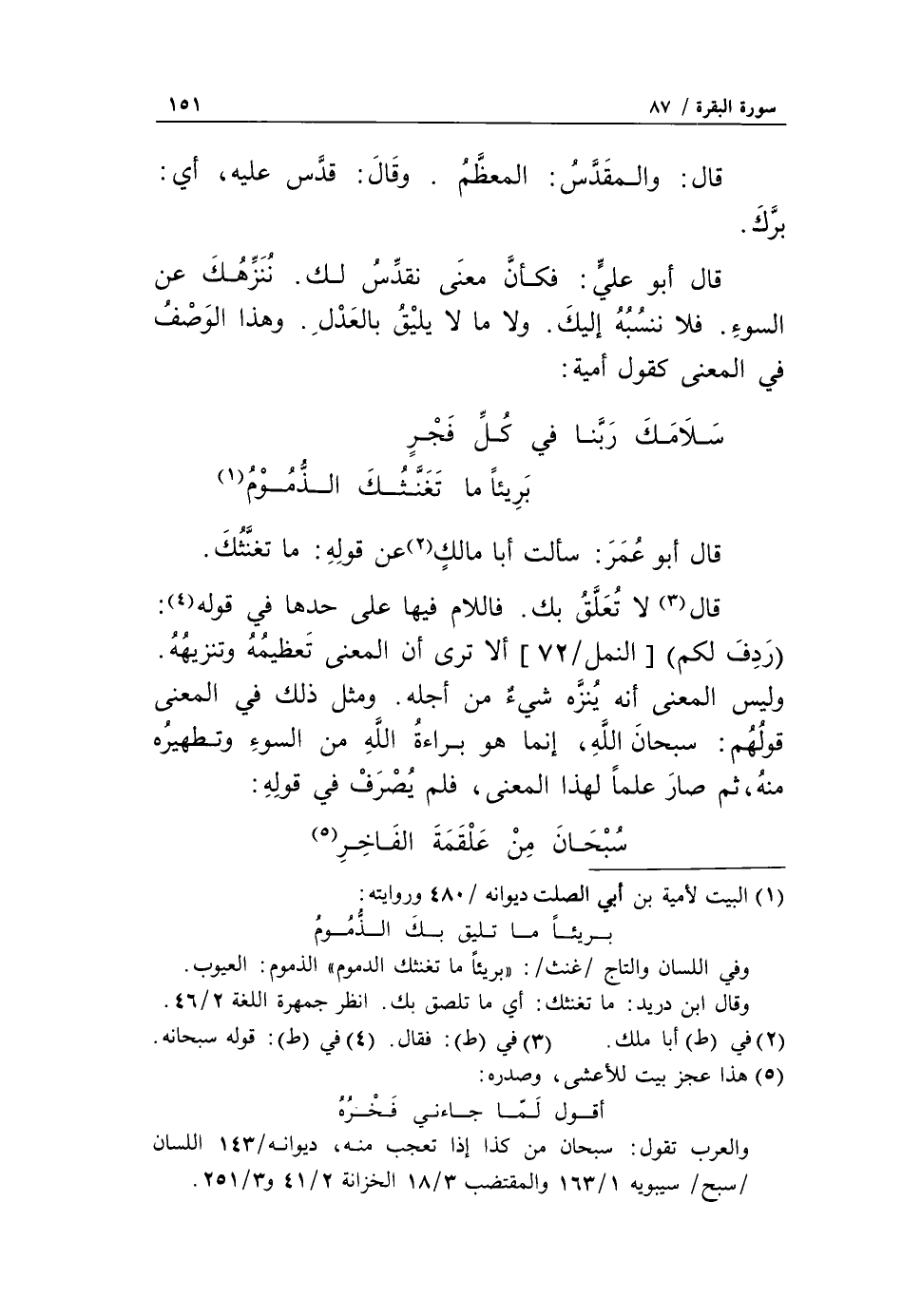 قال أبو عليّ: فكأنّ معنى نقدّس لك. ننزّهك عن السوء. فلا ننسبه إليك. ولا ما لا يليق بالعدل. وهذا الوصف في المعنى كقول أمية: