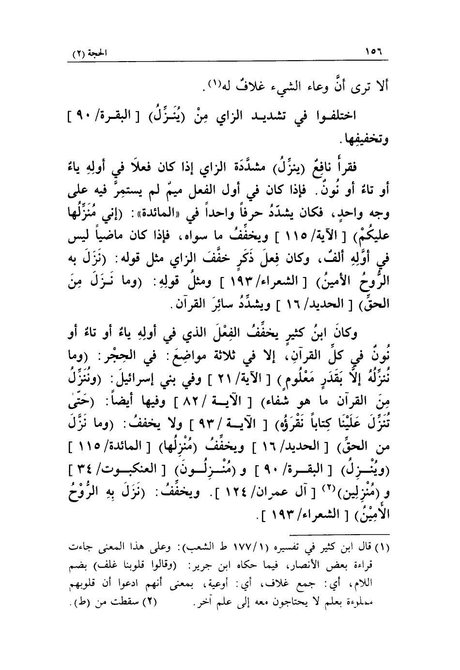 وكان ابن كثير يخفّف الفعل الذي في أوله ياء أو تاء أو نون في كلّ القرآن، إلا في ثلاثة مواضع: في الحجر: وَما نُنَزِّلُهُ إِلَّا بِقَدَرٍ مَعْلُومٍ [الآية/ 21] وفي بني إسرائيل: وَنُنَزِّلُ مِنَ الْقُرْآنِ ما هُوَ شِفاءٌ [الآية/ 82] وفيها أيضا: حَتَّى تُنَزِّلَ عَلَيْنا كِتاباً نَقْرَؤُهُ [الآية/ 93] ولا يخفف: وَما نَزَلَ مِنَ الْحَقِّ [الحديد/ 16] ويخفّف مُنَزِّلُها [المائدة/ 115] وَيُنَزِّلُ [البقرة/ 90] ومُنْزِلُونَ [العنكبوت/ 34] ومُنْزَلِينَ «2» [آل عمران/ 124]. ويخفّف: نَزَلَ بِهِ الرُّوحُ الْأَمِينُ [الشعراء/ 193].