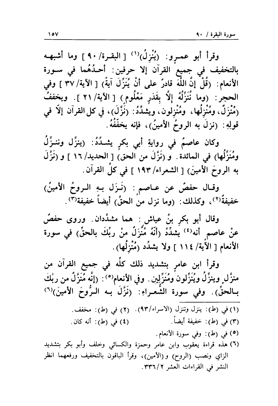 وقرأ أبو عمرو: يُنَزِّلَ «1» [البقرة/ 90] وما أشبهه بالتخفيف في جميع القرآن إلا حرفين: أحدهما في سورة الأنعام: قُلْ إِنَّ اللَّهَ قادِرٌ عَلى أَنْ يُنَزِّلَ آيَةً [الآية/ 37] وفي الحجر: وَما نُنَزِّلُهُ إِلَّا بِقَدَرٍ مَعْلُومٍ [الآية/ 21]. ويخفف مُنَزَّلٌ، ومُنَزِّلُها، ومُنْزِلُونَ، ويشدّد: نَزَّلَ، في كل القرآن إلّا في قوله: نَزَلَ بِهِ الرُّوحُ الْأَمِينُ، فإنه يخفّفه.