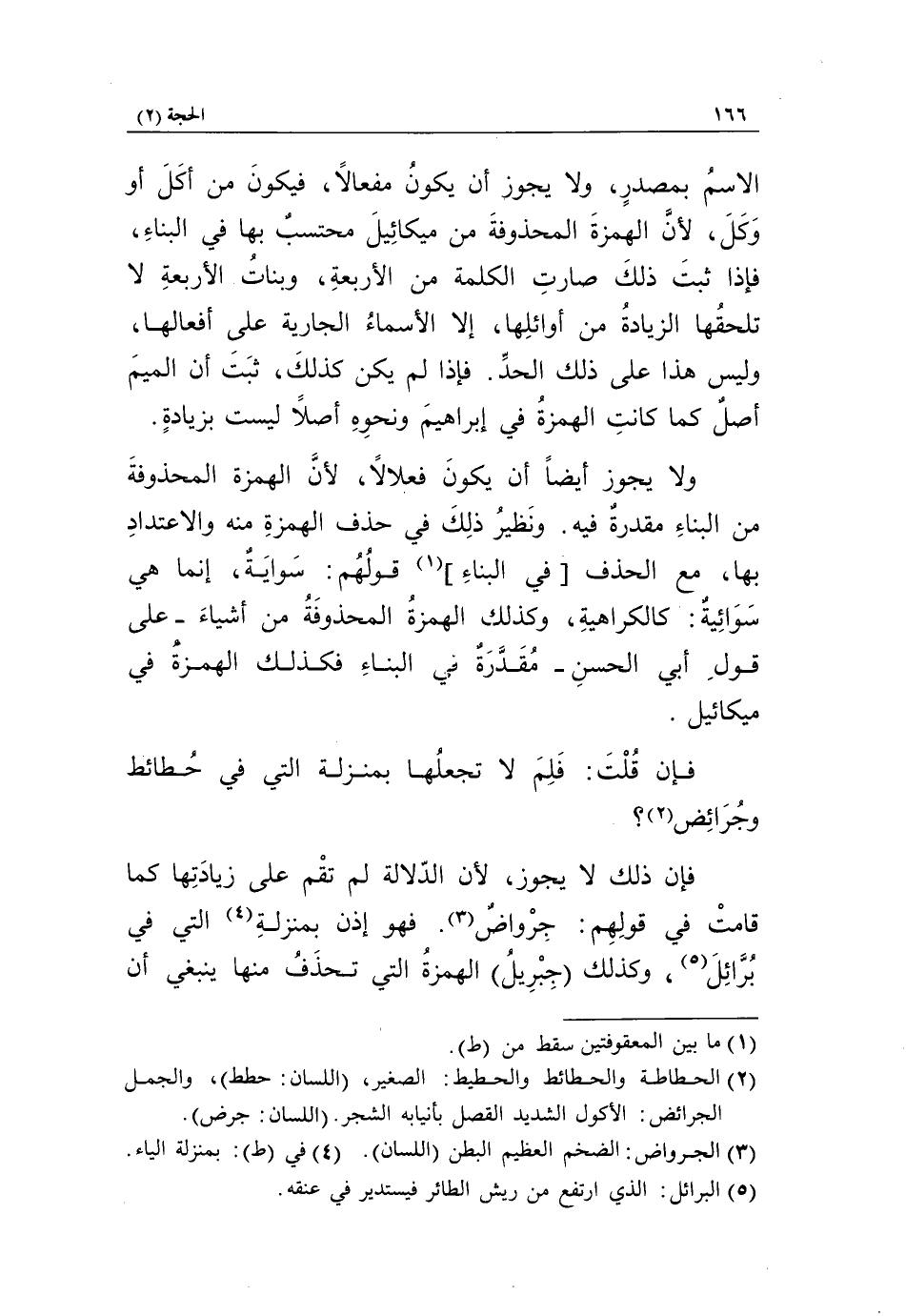فإن ذلك لا يجوز، لأن الدّلالة لم تقم على زيادتها كما قامت في قولهم: جرواض «3». فهو إذن بمنزلة «4» التي في برائل «5»، وكذلك (جِبْرِيلَ) الهمزة التي تحذف منها ينبغي أن