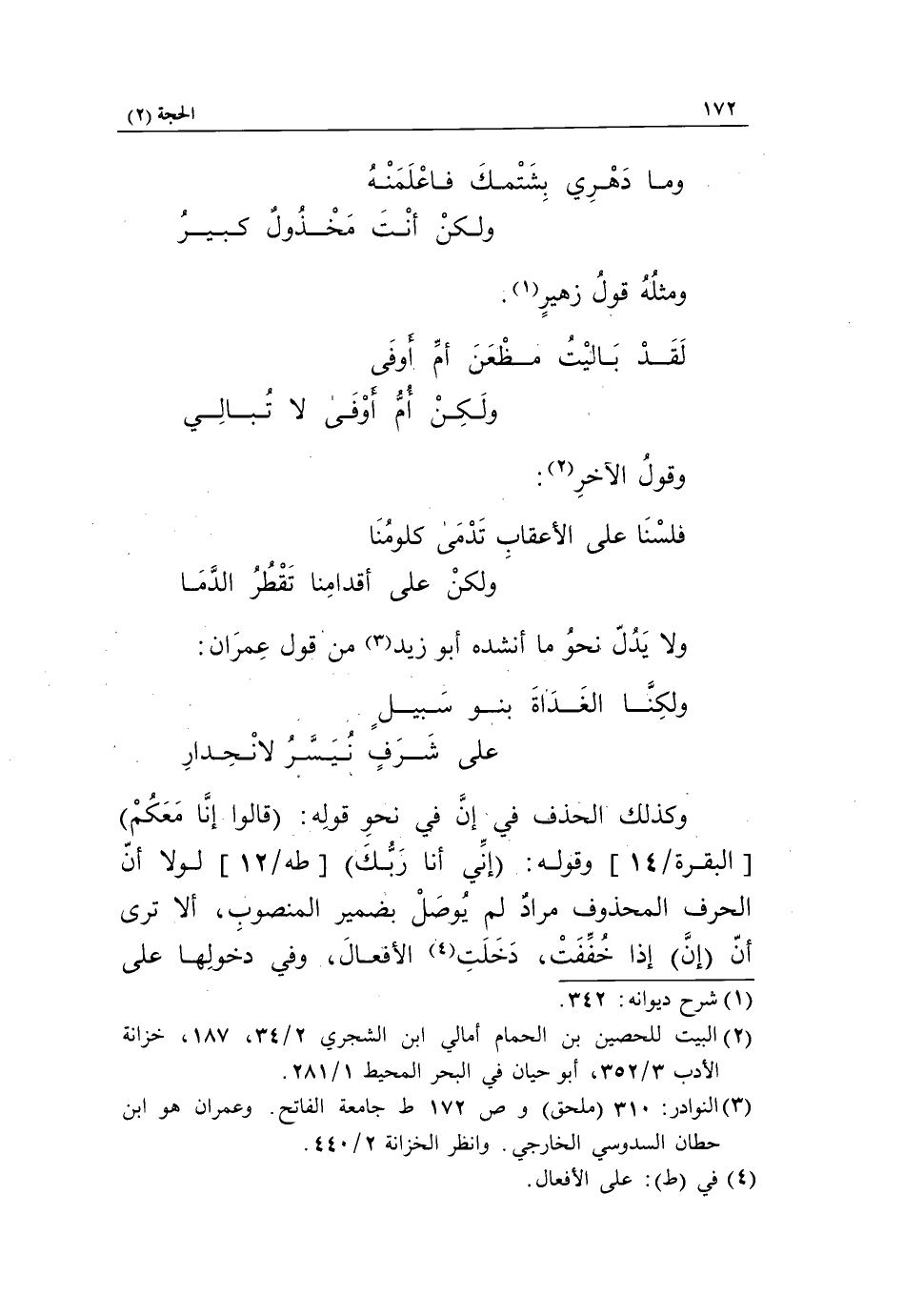 (3) النوادر: 310 (ملحق) وص 172 ط جامعة الفاتح. وعمران هو ابن حطان السدوسي الخارجي. وانظر الخزانة 2/ 440.