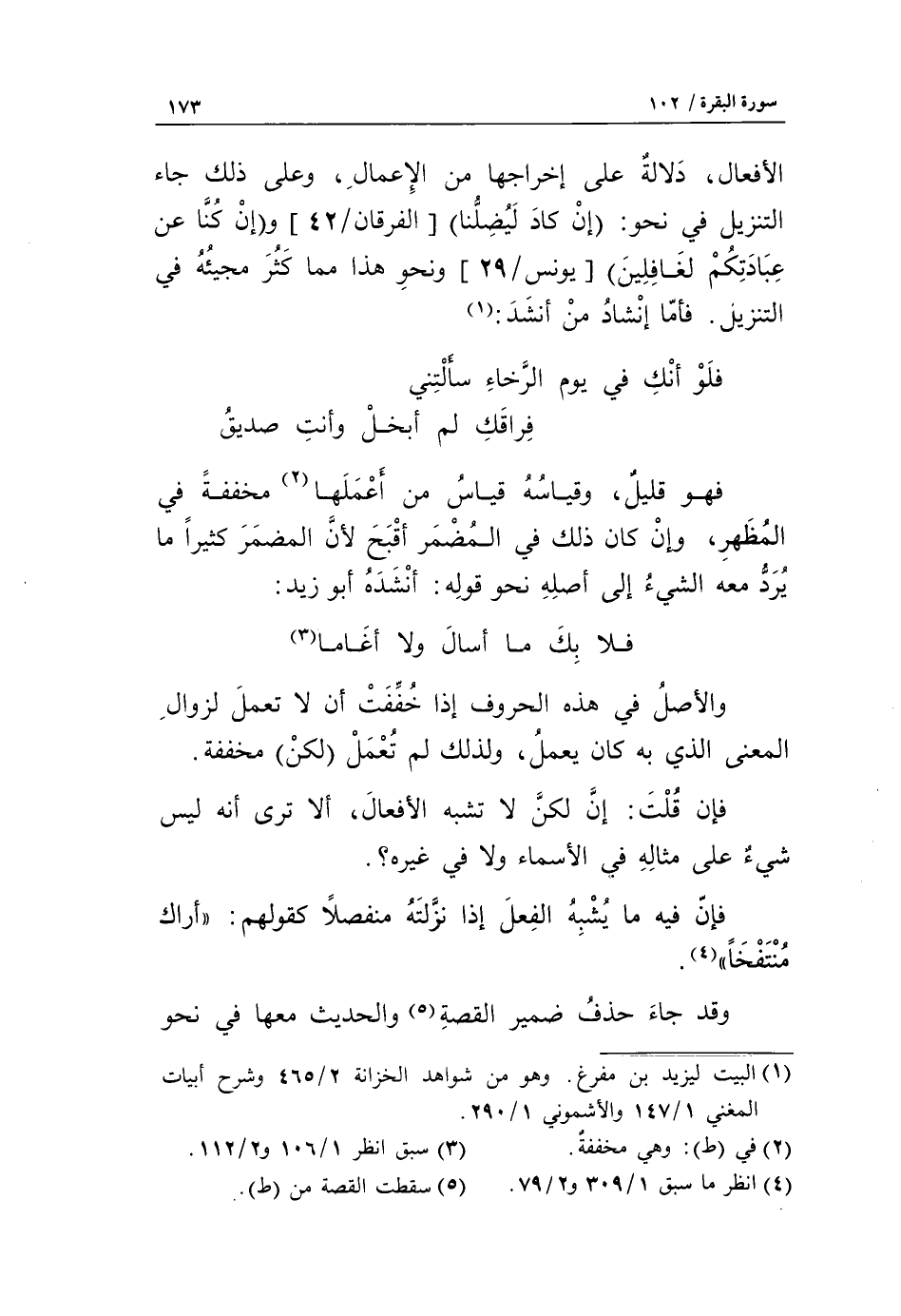 الأفعال، دلالة على إخراجها من الإعمال، وعلى ذلك جاء التنزيل في نحو: إِنْ كادَ لَيُضِلُّنا [الفرقان/ 42] وإِنْ كُنَّا عَنْ عِبادَتِكُمْ لَغافِلِينَ [يونس/ 29] ونحو هذا مما كثر مجيئه في التنزيل. فأمّا إنشاد من أنشد: «1»