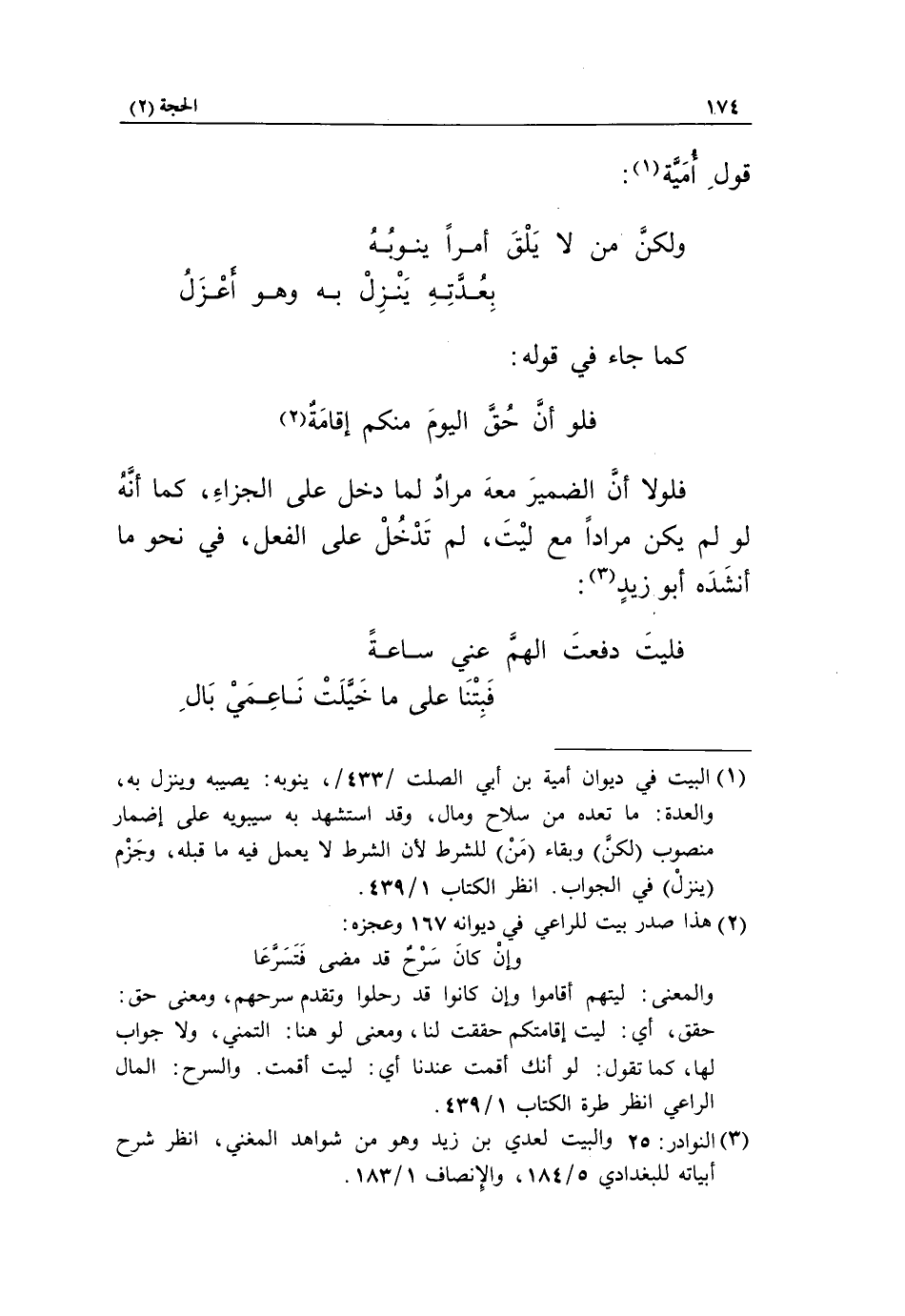 فلو أنّ حقّ اليوم منكم إقامة «2» فلولا أنّ الضمير معه مراد لما دخل على الجزاء، كما أنّه لو لم يكن مرادا مع ليت، لم تدخل على الفعل، في نحو ما أنشده أبو زيد «3»: