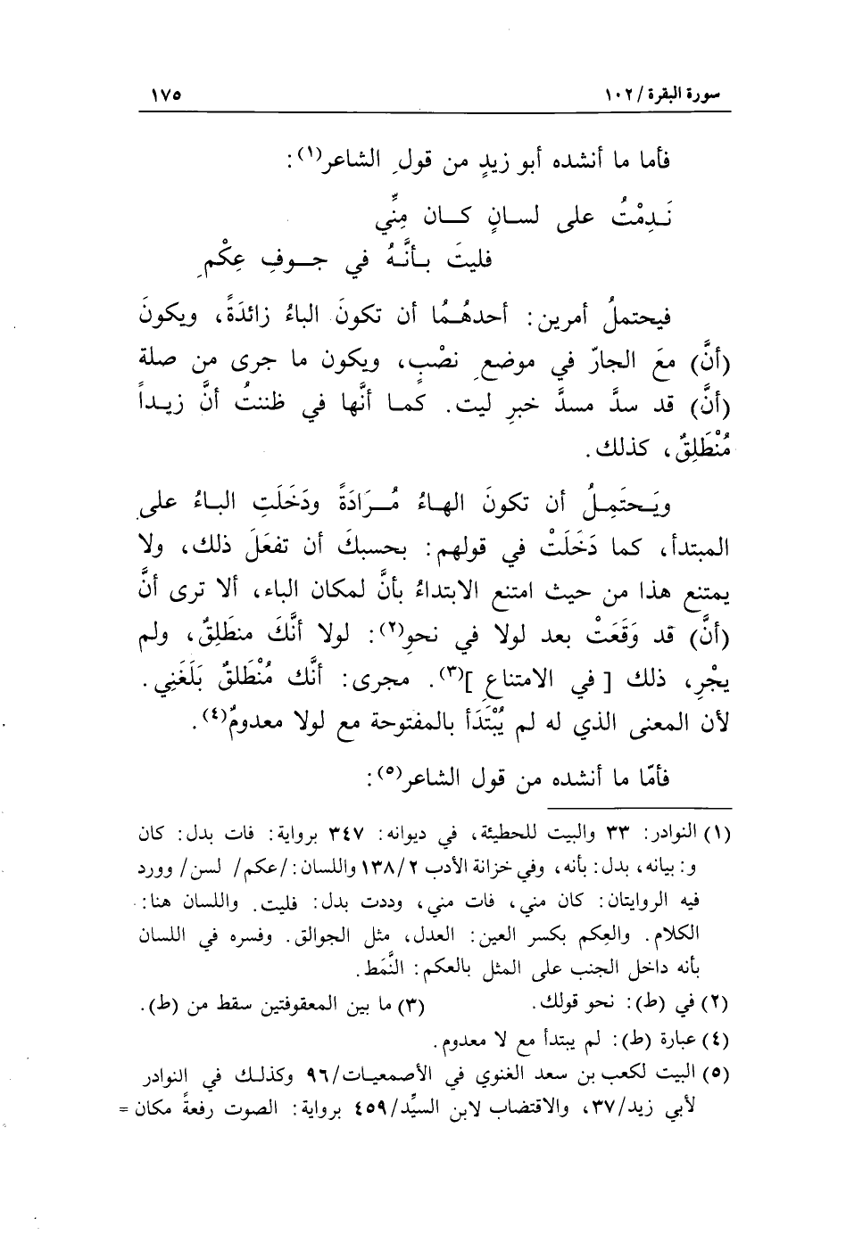 (1) النوادر: 33 والبيت للحطيئة، في ديوانه: 347 برواية: فات بدل: كان و: بيانه، بدل: بأنه، وفي خزانة الأدب 2/ 138 واللسان:/ عكم/ لسن/ وورد فيه الروايتان: كان مني، فات مني، وددت بدل: فليت. واللسان هنا: