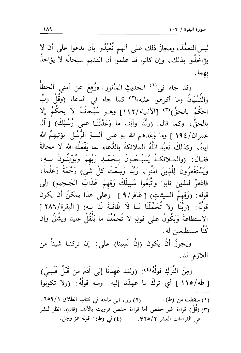 ليس التعمّد، ومجاز ذلك على أنهم تعبّدوا بأن يدعوا على أن لا يؤاخذوا بذلك، وإن كانوا قد علموا أن القديم سبحانه لا يؤاخذ بهما.