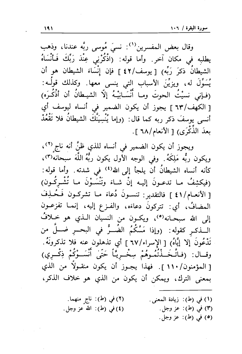 وقال بعض المفسرين «1»: نسي موسى ربّه عندنا، وذهب يطلبه في مكان آخر. وأما قوله: اذْكُرْنِي عِنْدَ رَبِّكَ فَأَنْساهُ الشَّيْطانُ ذِكْرَ رَبِّهِ [يوسف/ 42] فإن إنساء الشيطان هو أن يسوّل له، ويزيّن الأسباب التي ينسى معها. وكذلك قوله: