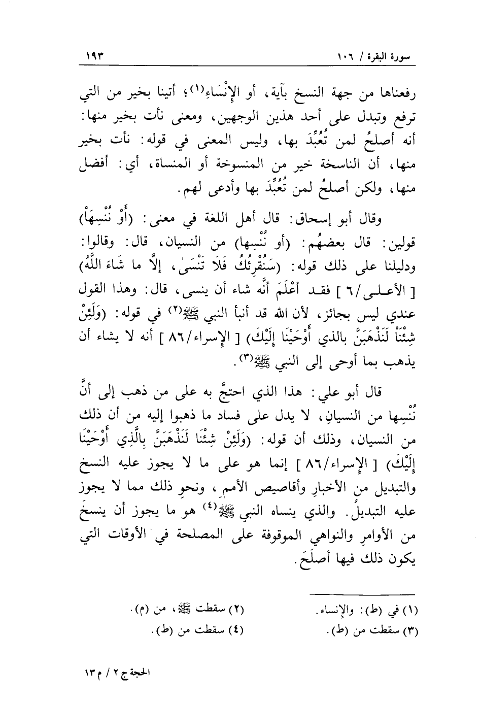 قال أبو علي: هذا الذي احتجّ به على من ذهب إلى أنّ ننسها من النسيان، لا يدل على فساد ما ذهبوا إليه من أن ذلك من النسيان، وذلك أن قوله: وَلَئِنْ شِئْنا لَنَذْهَبَنَّ بِالَّذِي أَوْحَيْنا إِلَيْكَ [الإسراء/ 86] إنما هو على ما لا يجوز عليه النسخ والتبديل من الأخبار وأقاصيص الأمم، ونحو ذلك مما لا يجوز عليه التبديل. والذي ينساه النبي صلّى الله عليه وآله وسلّم «4» هو ما يجوز أن ينسخ من الأوامر والنواهي الموقوفة على المصلحة في الأوقات التي يكون ذلك فيها أصلح.