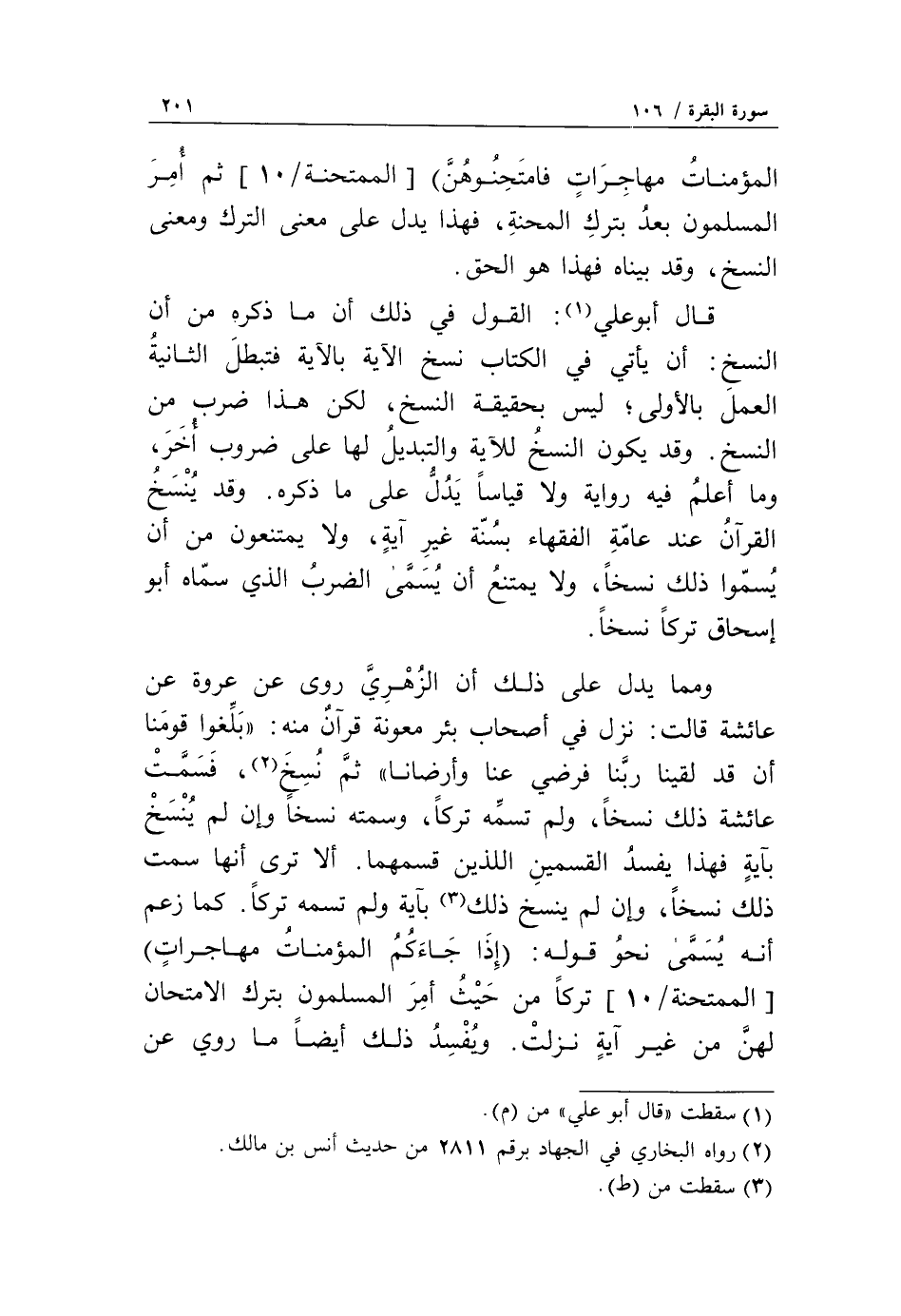 ومما يدل على ذلك أن الزهري روى عن عروة عن عائشة قالت: نزل في أصحاب بئر معونة قرآن منه: «بلّغوا قومنا أن قد لقينا ربّنا فرضي عنا وأرضانا» ثمّ نسخ «2»، فسمّت عائشة ذلك نسخا، ولم تسمّه تركا، وسمته نسخا وإن لم ينسخ بآية فهذا يفسد القسمين اللذين قسمهما. ألا ترى أنها سمت ذلك نسخا، وإن لم ينسخ ذلك «3» بآية ولم تسمه تركا. كما زعم أنه يسمّى نحو قوله: إِذا جاءَكُمُ الْمُؤْمِناتُ مُهاجِراتٍ [الممتحنة/ 10] تركا من حيث أمر المسلمون بترك الامتحان لهنّ من غير آية نزلت. ويفسد ذلك أيضا ما روي عن