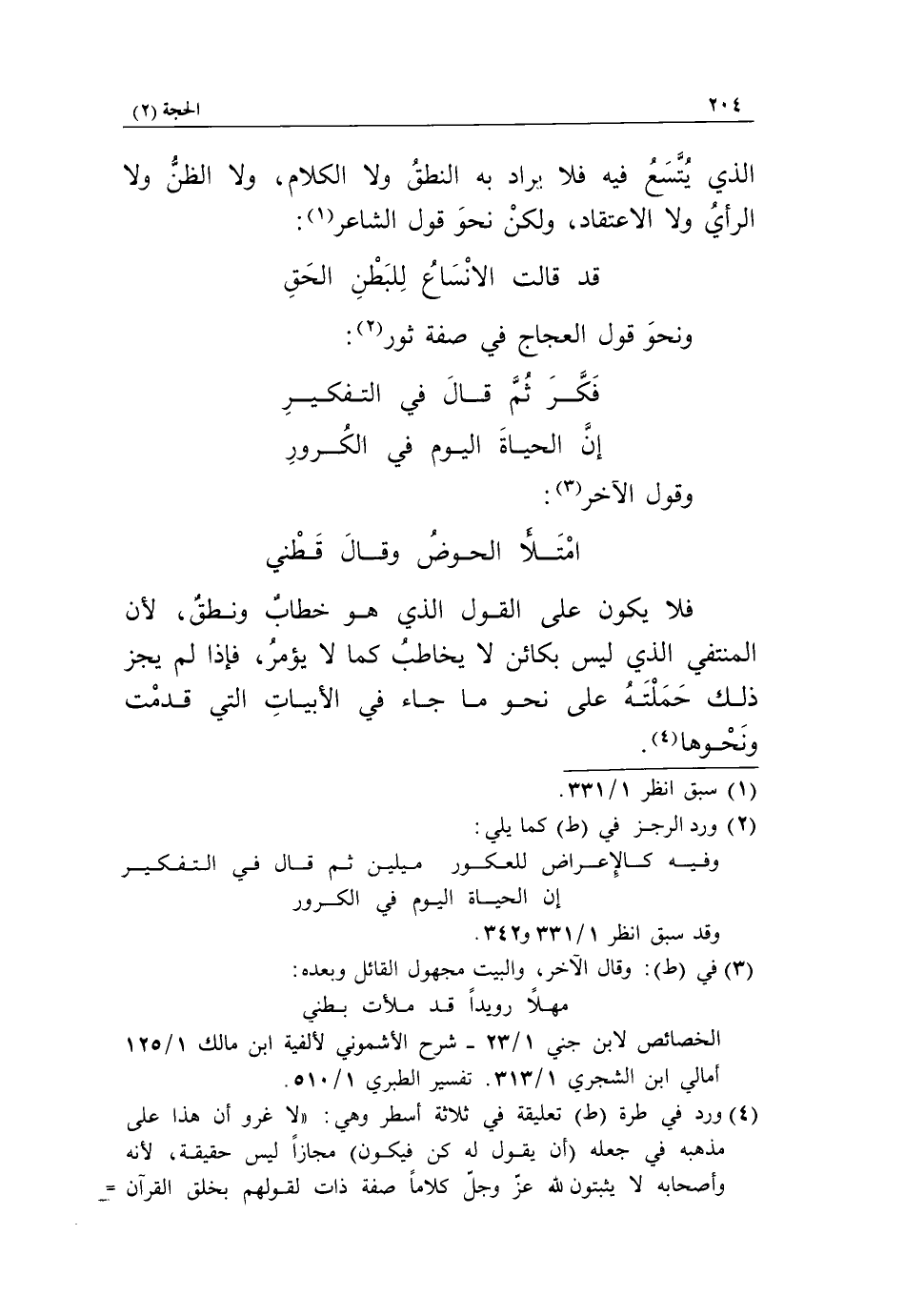 (4) ورد في طرة (ط) تعليقة في ثلاثة أسطر وهي: «لا غرو أن هذا على مذهبه في جعله (أَنْ يَقُولَ لَهُ كُنْ فَيَكُونُ) مجازا ليس حقيقة، لأنه وأصحابه لا يثبتون لله عزّ وجلّ كلاما صفة ذات لقولهم بخلق القرآن