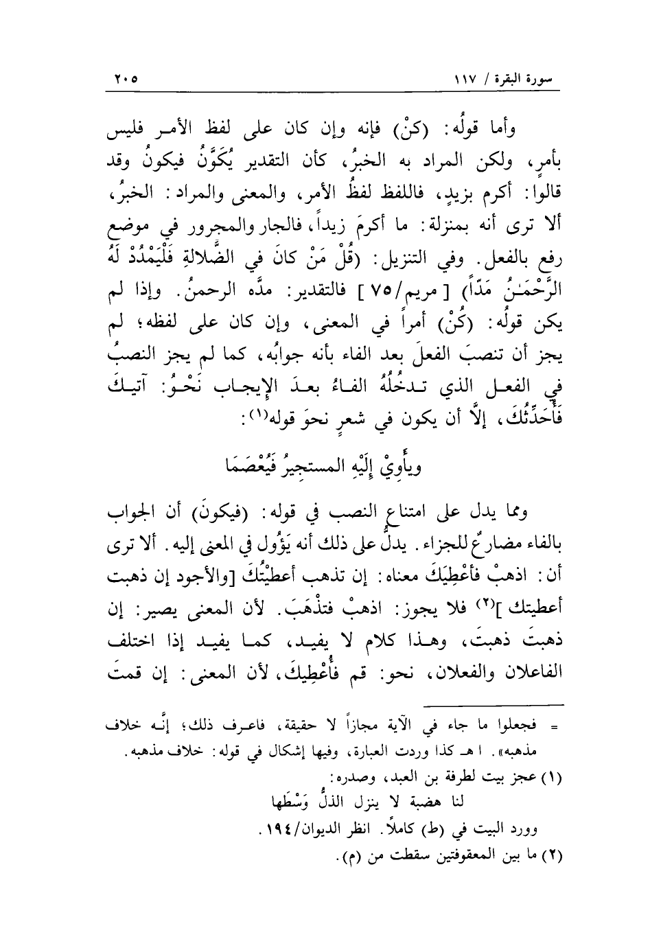 وأما قوله: كُنْ فإنه وإن كان على لفظ الأمر فليس بأمر، ولكن المراد به الخبر، كأن التقدير يكوّن فيكون وقد قالوا: أكرم بزيد، فاللفظ لفظ الأمر، والمعنى والمراد: الخبر، ألا ترى أنه بمنزلة: ما أكرم زيدا، فالجار والمجرور في موضع رفع بالفعل. وفي التنزيل: قُلْ مَنْ كانَ فِي الضَّلالَةِ فَلْيَمْدُدْ لَهُ الرَّحْمنُ مَدًّا [مريم/ 75] فالتقدير: مدّه الرحمن. وإذا لم يكن قوله: كُنْ أمرا في المعنى، وإن كان على لفظه؛ لم يجز أن تنصب الفعل بعد الفاء بأنه جوابه، كما لم يجز النصب في الفعل الذي تدخله الفاء بعد الإيجاب نحو: آتيك فأحدّثك، إلّا أن يكون في شعر نحو قوله «1»: