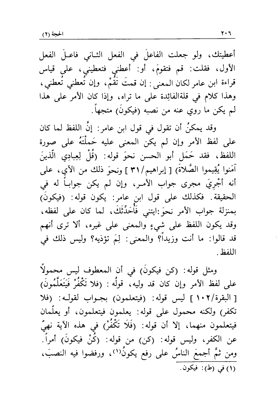 وقد يمكن أن تقول في قول ابن عامر: إنّ اللفظ لما كان على لفظ الأمر وإن لم يكن المعنى عليه حملته على صورة اللفظ، فقد حمل أبو الحسن نحو قوله: قُلْ لِعِبادِيَ الَّذِينَ آمَنُوا يُقِيمُوا الصَّلاةَ [إبراهيم/ 31] ونحو ذلك من الآي، على أنه أجري مجرى جواب الأمر، وإن لم يكن جوابا له في الحقيقة. فكذلك على قول ابن عامر: يكون قوله: فَيَكُونُ بمنزلة جواب الأمر نحو: ايتني فأحدّثك، لما كان على لفظه، وقد يكون اللفظ على شيء والمعنى على غيره، ألا ترى أنهم قد قالوا: ما أنت وزيدا؟ والمعنى: لم تؤذيه؟ وليس ذلك في اللفظ.