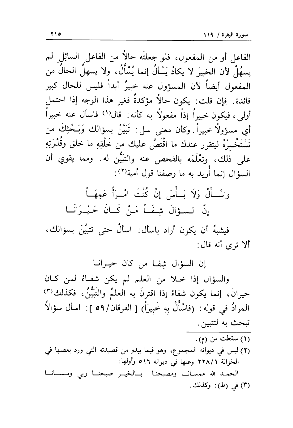 إن السؤال شفا من كان حيرانا والسؤال إذا خلا من العلم لم يكن شفاء لمن كان حيران، إنما يكون شفاء إذا اقترن به العلم والتبيّن، فكذلك «3» المراد في قوله: فَسْئَلْ بِهِ خَبِيراً [الفرقان/ 59]: اسأل سؤالًا تبحث به لتتبين.