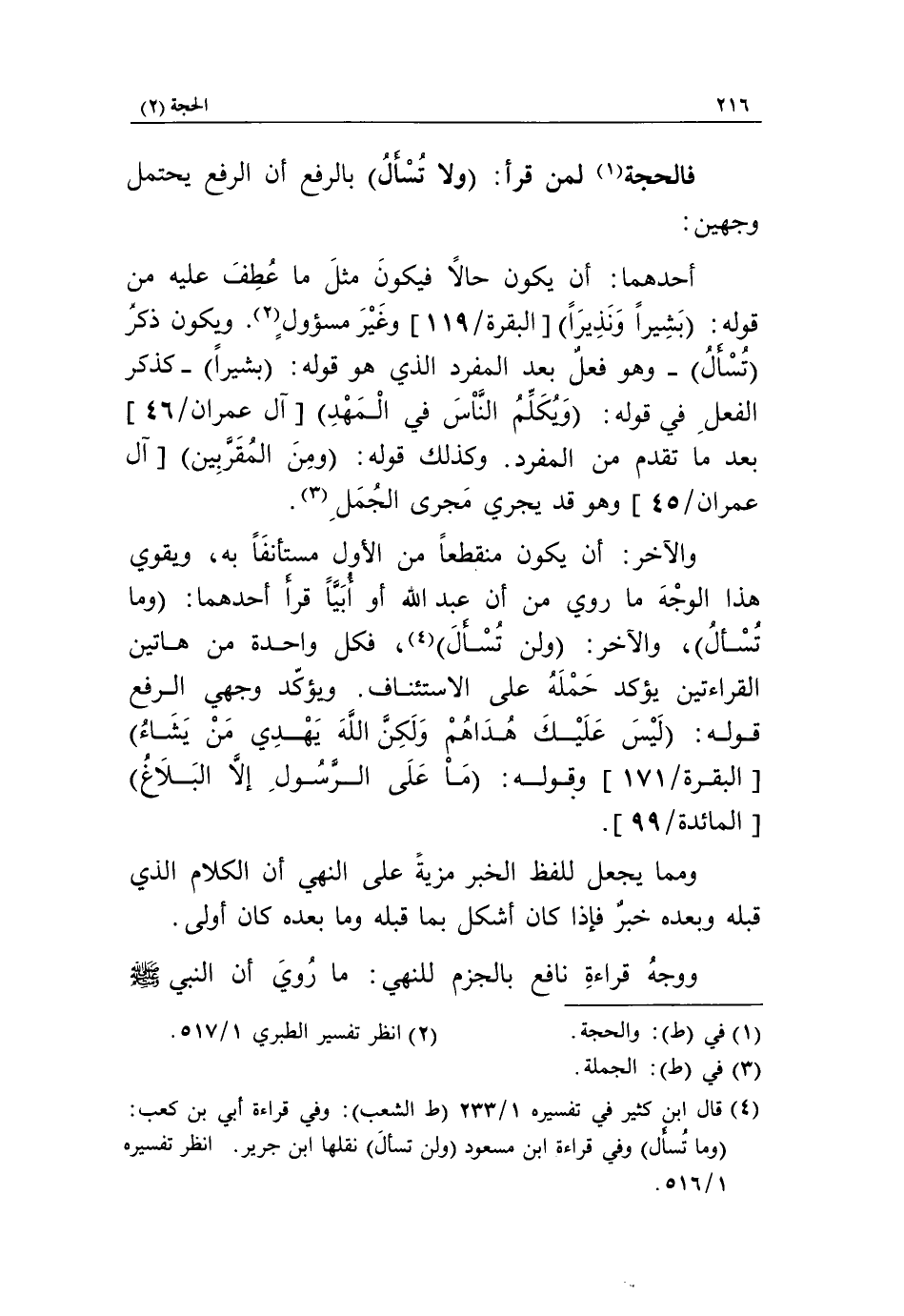 والآخر: أن يكون منقطعاً من الأول مستأنفاً به، ويقوي هذا الوجه ما روي من أن عبد الله أو أبيّا قرأ أحدهما: وما تسأل، والآخر: ولن تسأل «4»، فكل واحدة من هاتين القراءتين يؤكد حمله على الاستئناف. ويؤكّد وجهي الرفع قوله: لَيْسَ عَلَيْكَ هُداهُمْ وَلكِنَّ اللَّهَ يَهْدِي مَنْ يَشاءُ [البقرة/ 171] وقوله: ما عَلَى الرَّسُولِ إِلَّا الْبَلاغُ [المائدة/ 99].