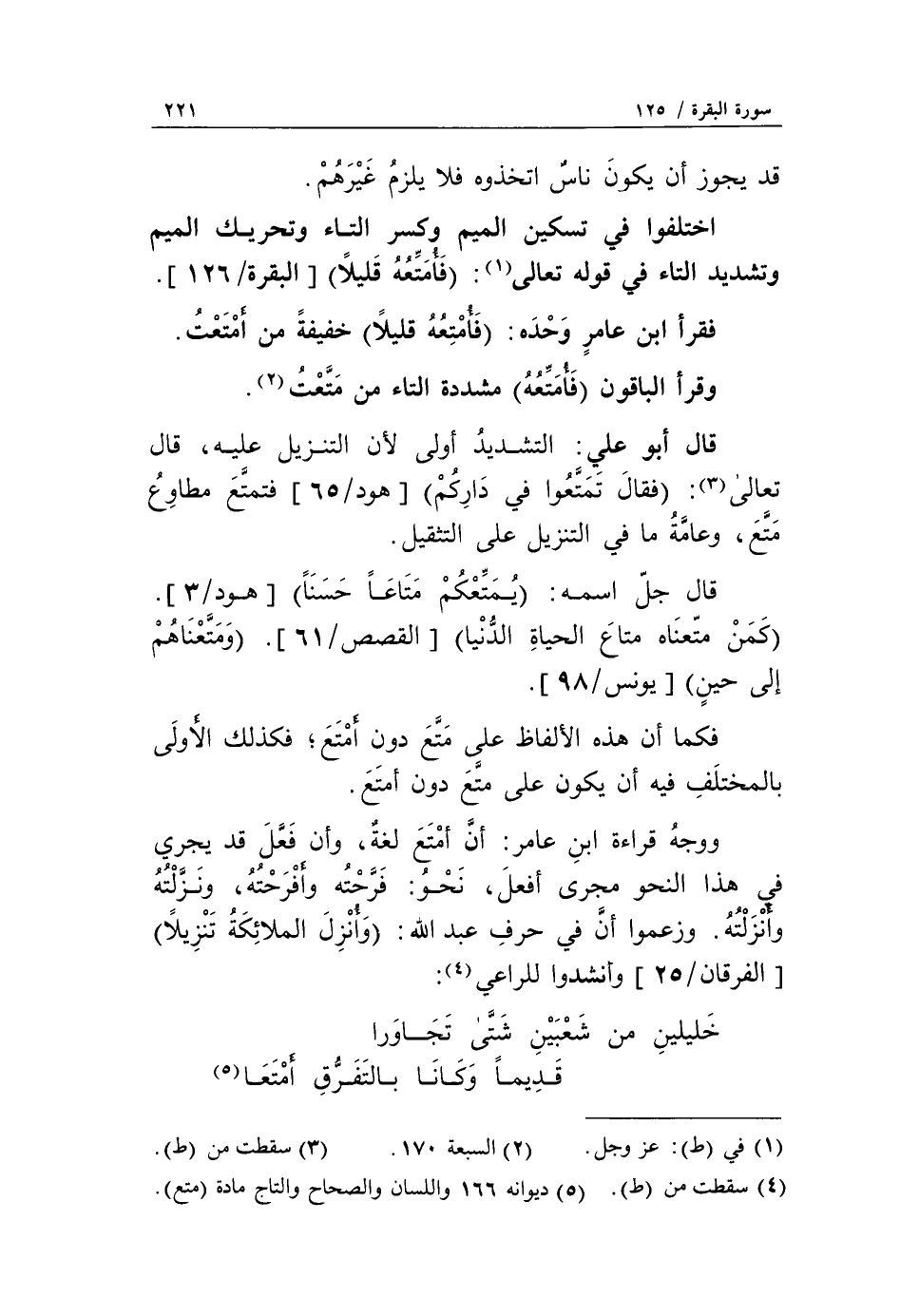 ووجه قراءة ابن عامر: أنّ أمتع لغة، وأن فعّل قد يجري في هذا النحو مجرى أفعل، نحو: فرّحته وأفرحته، ونزّلته وأنزلته. وزعموا أنّ في حرف عبد الله: وَنُزِّلَ الْمَلائِكَةُ تَنْزِيلًا [الفرقان/ 25] وأنشدوا للراعي «4»: