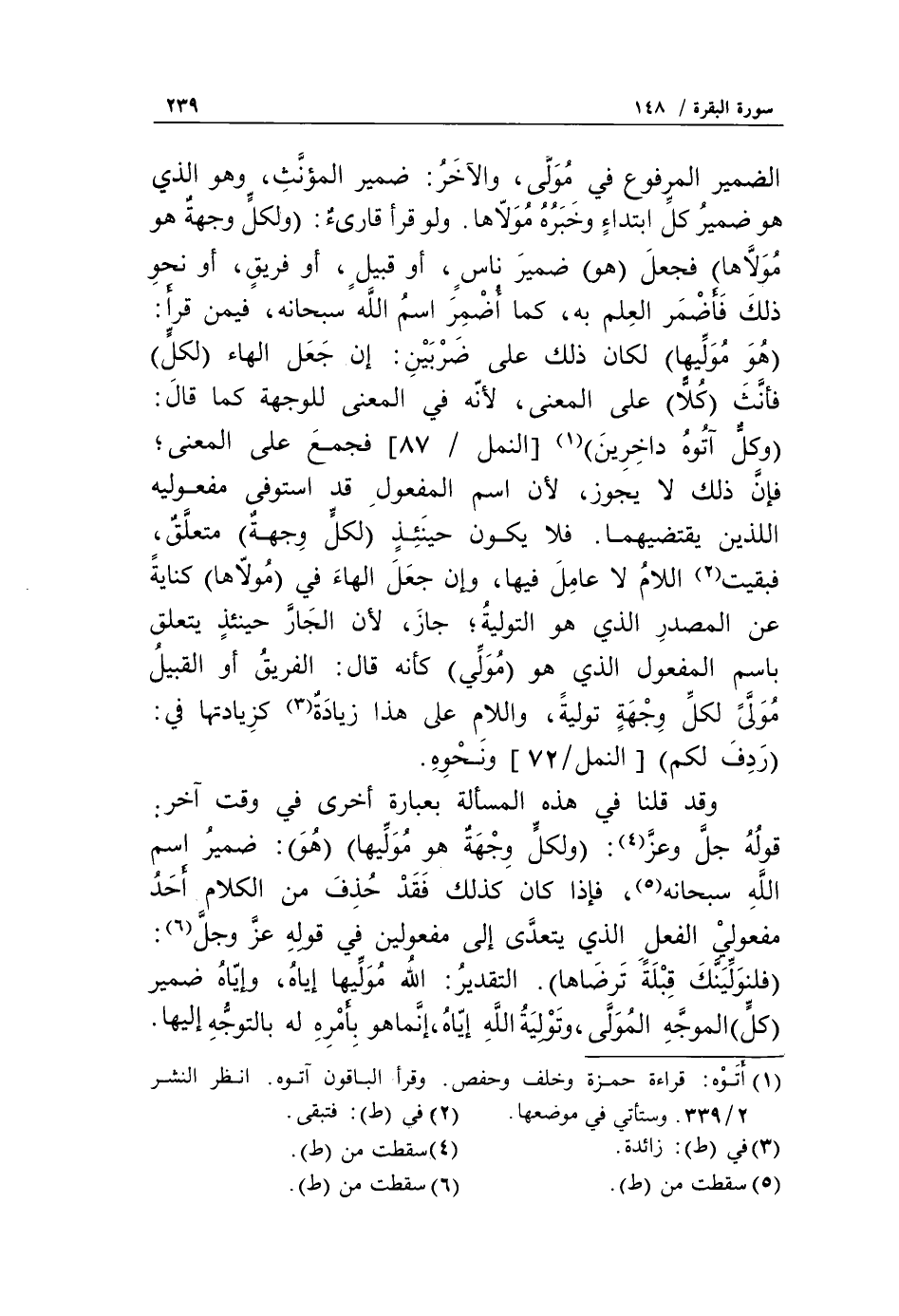 قوله جلّ وعزّ «4»: وَلِكُلٍّ وِجْهَةٌ هُوَ مُوَلِّيها هُوَ: ضمير اسم الله سبحانه «5»، فإذا كان كذلك فقد حذف من الكلام أحد مفعولي الفعل الذي يتعدّى إلى مفعولين في قوله عزّ وجلّ «6»: