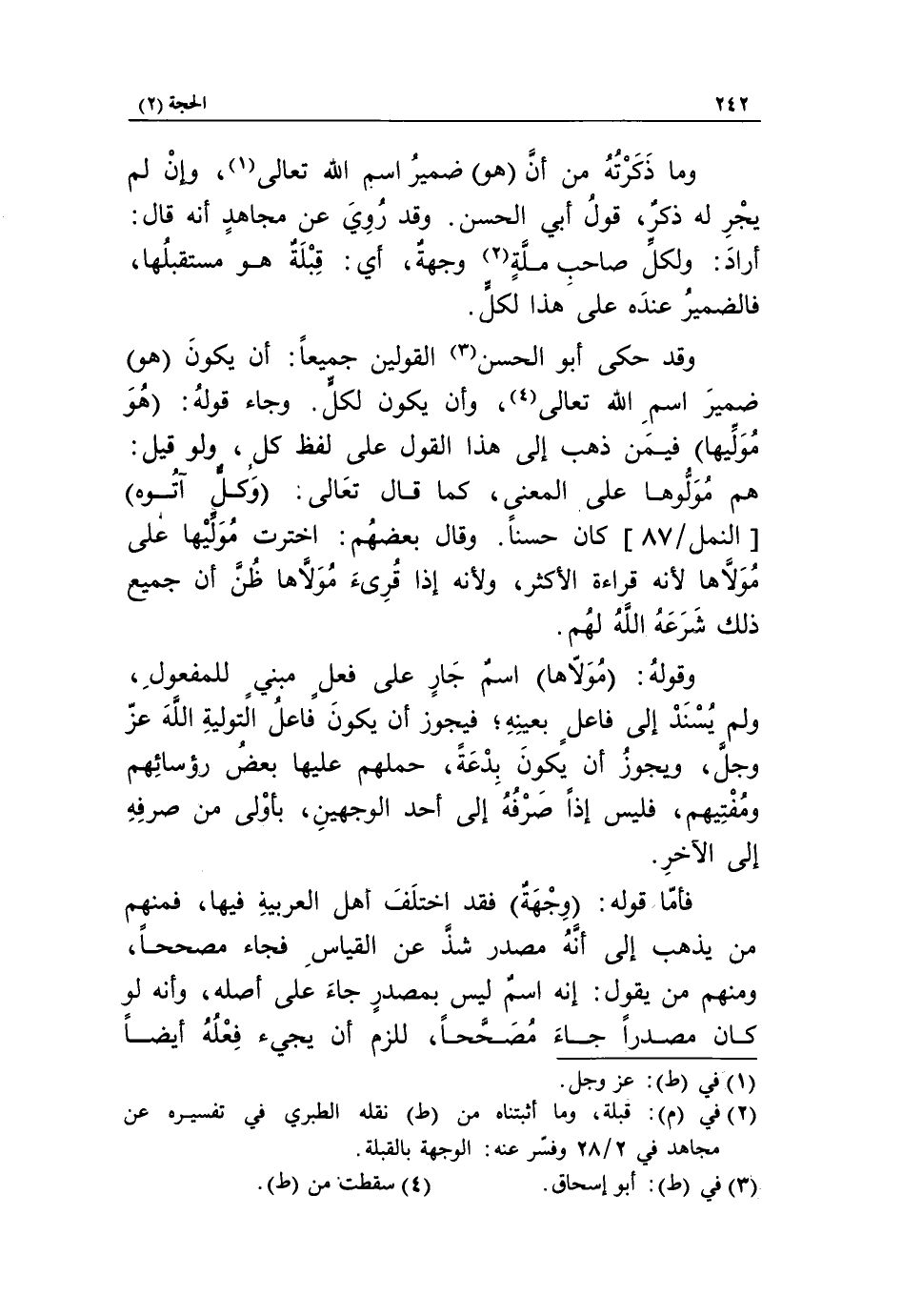 هم مولّوها على المعنى، كما قال تعالى: وَكُلٌّ أَتَوْهُ [النمل/ 87] كان حسناً. وقال بعضهم: اخترت مولّيها على مولّاها لأنه قراءة الأكثر، ولأنه إذا قرئ مولّاها ظنّ أن جميع ذلك شرعه الله لهم.